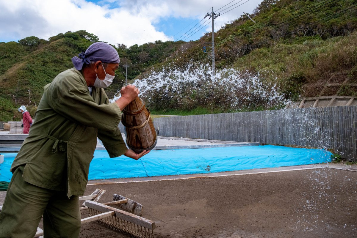 海水を人力でくみ上げて塩田に撒き、太陽の熱で水分を蒸発させて作る伝統製法「揚げ浜式製塩」で作られています。
