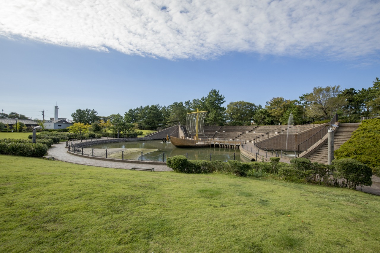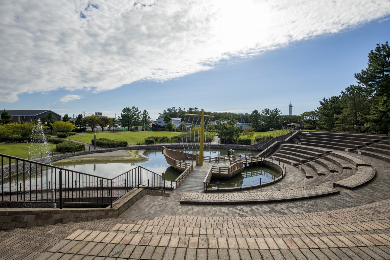 北前船のモニュメントを囲む様に、階段状の野外スタンド(観覧席)が設置されており、思い思いの場所に座ってくつろぐことも可能です。