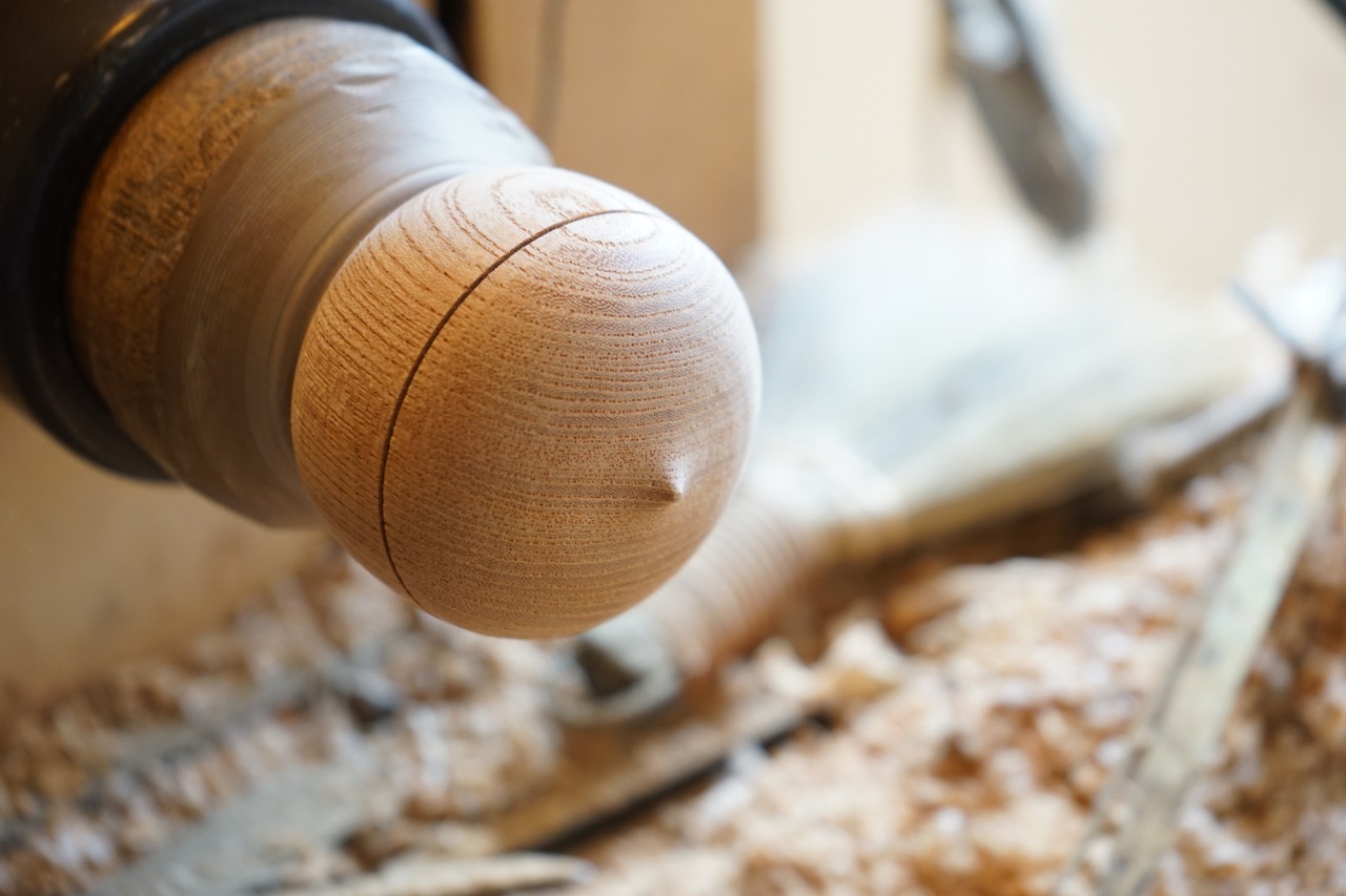 これをクルクルと回る木工ろくろにセットしたら、カンナという刃物を当てて削っていきます。