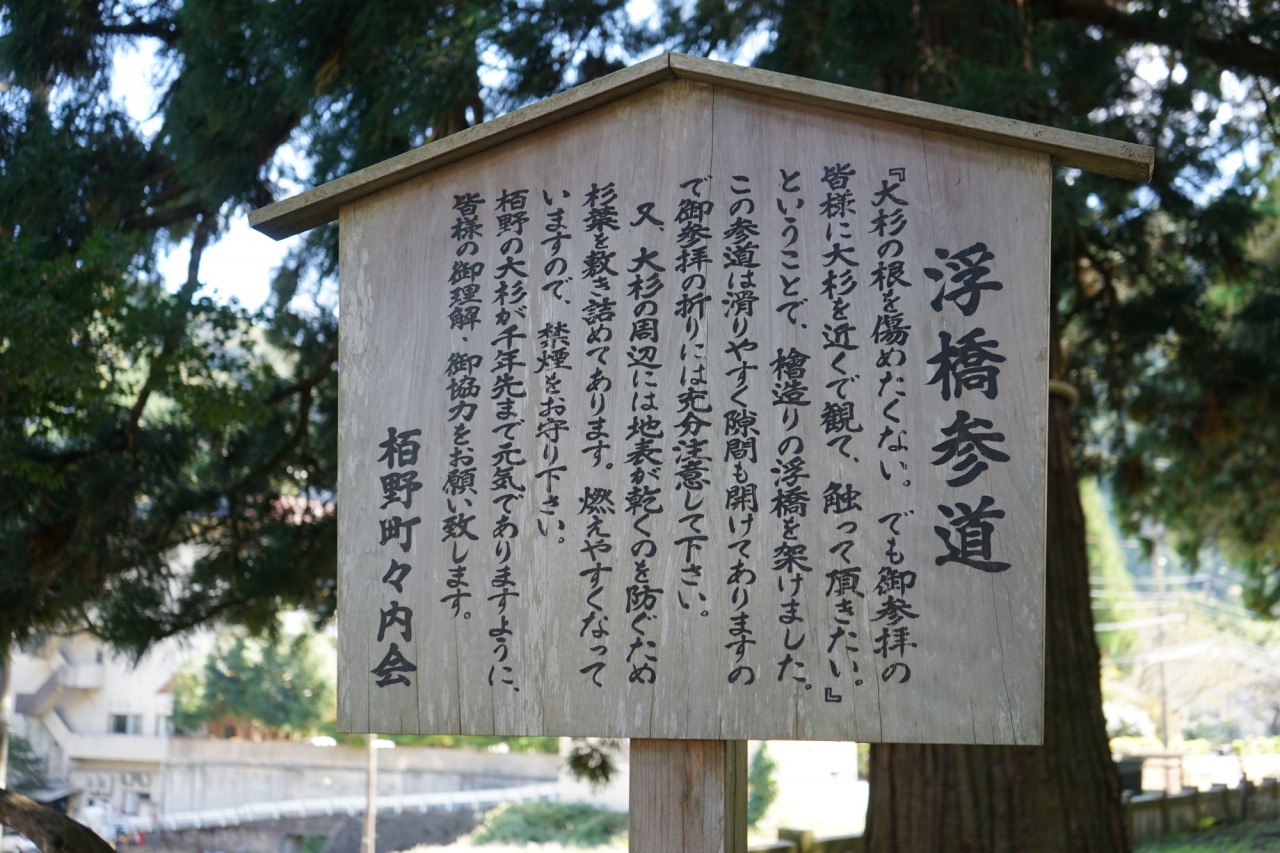 境内の立て札には「大杉の根を傷めたくない、でも御参拝の皆様に大杉を近くで観て、触っていただきたい」そんな目的で浮橋参道を架けたと記載がありました。