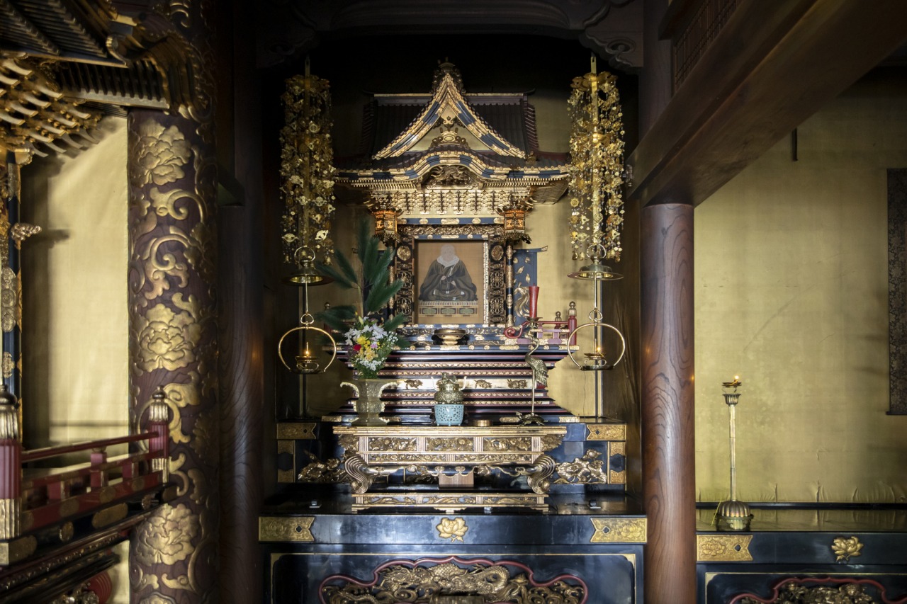 本堂の親鸞の肖像画は東本願寺の親鸞像同様、正面を向いたもので、東本願寺の本像の素材を混ぜた炭で衣が塗られているのだとか。