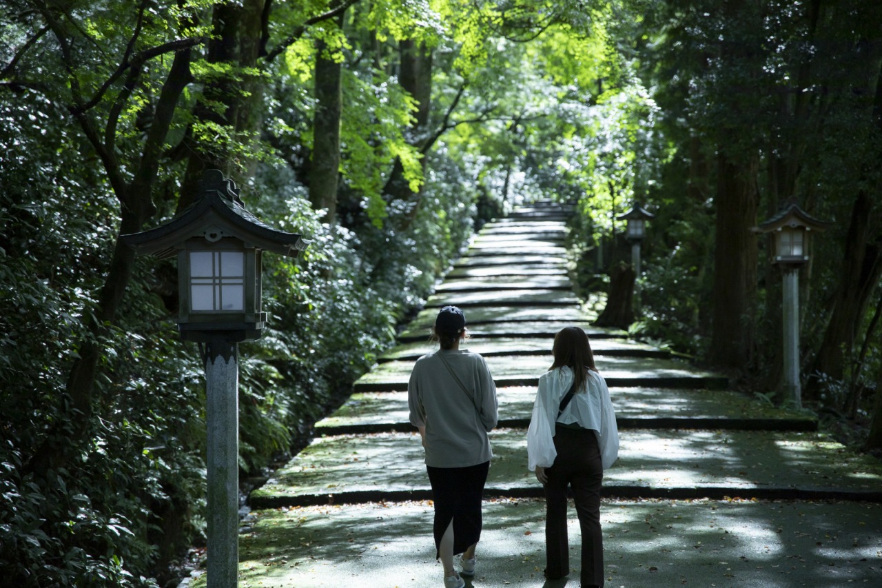 樹齢およそ800年と伝わるご神木の老杉をはじめとする豊かな植生と、琵琶滝から流れ落ちる清水のエネルギーを体いっぱいに浴びながら、約250mの表参道を歩くひとときはなんとも心地よいものです。