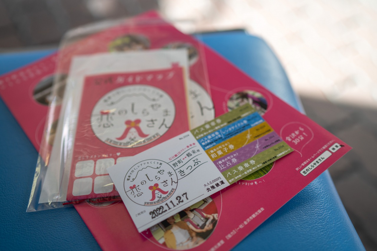「恋のしらやまさん」とは北陸鉄道の金沢市・野町駅から終着駅の白山市・鶴来駅まで電車に乗って、縁結びの神社『白山比咩神社(しらやまひめじんじゃ)』(通称:しらやまさん)にお参りし、鶴来の町並みや文化•歴史•味覚•パワースポット•人とのふれあいを堪能する旅の切符です。