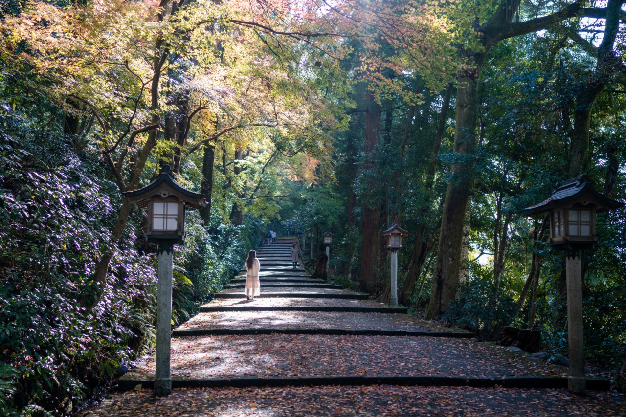 一の鳥居の奥を行くと、杉や欅、楓などの樹木に覆われた約250mの参道があります。
