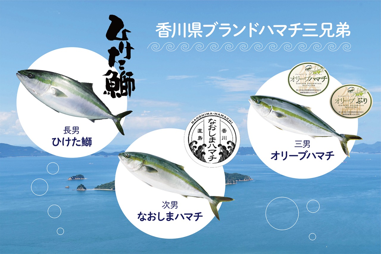 大きな生簀でのびのびと大らかに育った長男「ひけた鰤」、潮の流れの速い海で元気に育った次男「なおしまハマチ」、県魚のハマチと県木県花のオリーブのコラボーレーションによって生まれた三男「オリーブハマチ」。ハマチ養殖発祥の地ならではの歴史が築き上げ、個性があふれる「ハマチ三兄弟」は、県民に広く愛されています。