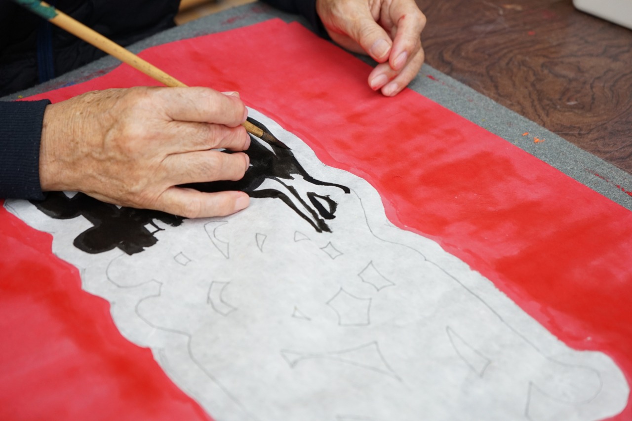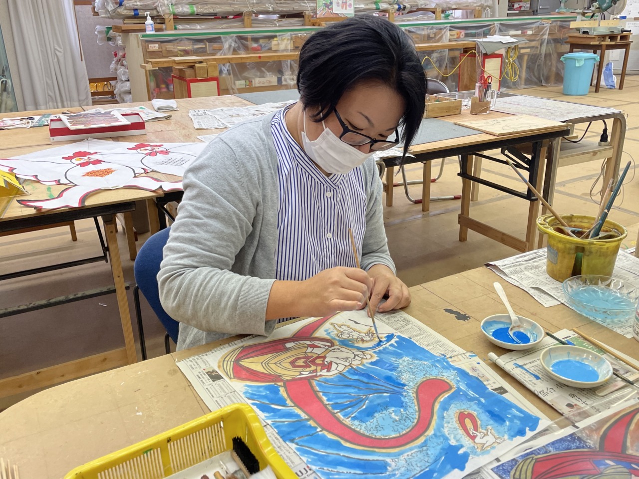 色付けは、下絵が浮き出てくるように絵の具を水で薄く溶いて、サッと塗るのがポイントだと教わりました。
