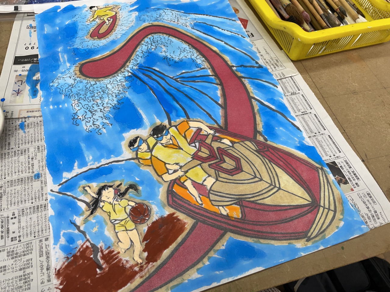 細かい部分に色付けしていくのが難しく、隅々までしっかり塗られていない部分もありますが・・・、内灘の海のダイナミックさが伝わる仕上がりになったのでは、と自画自賛(笑)