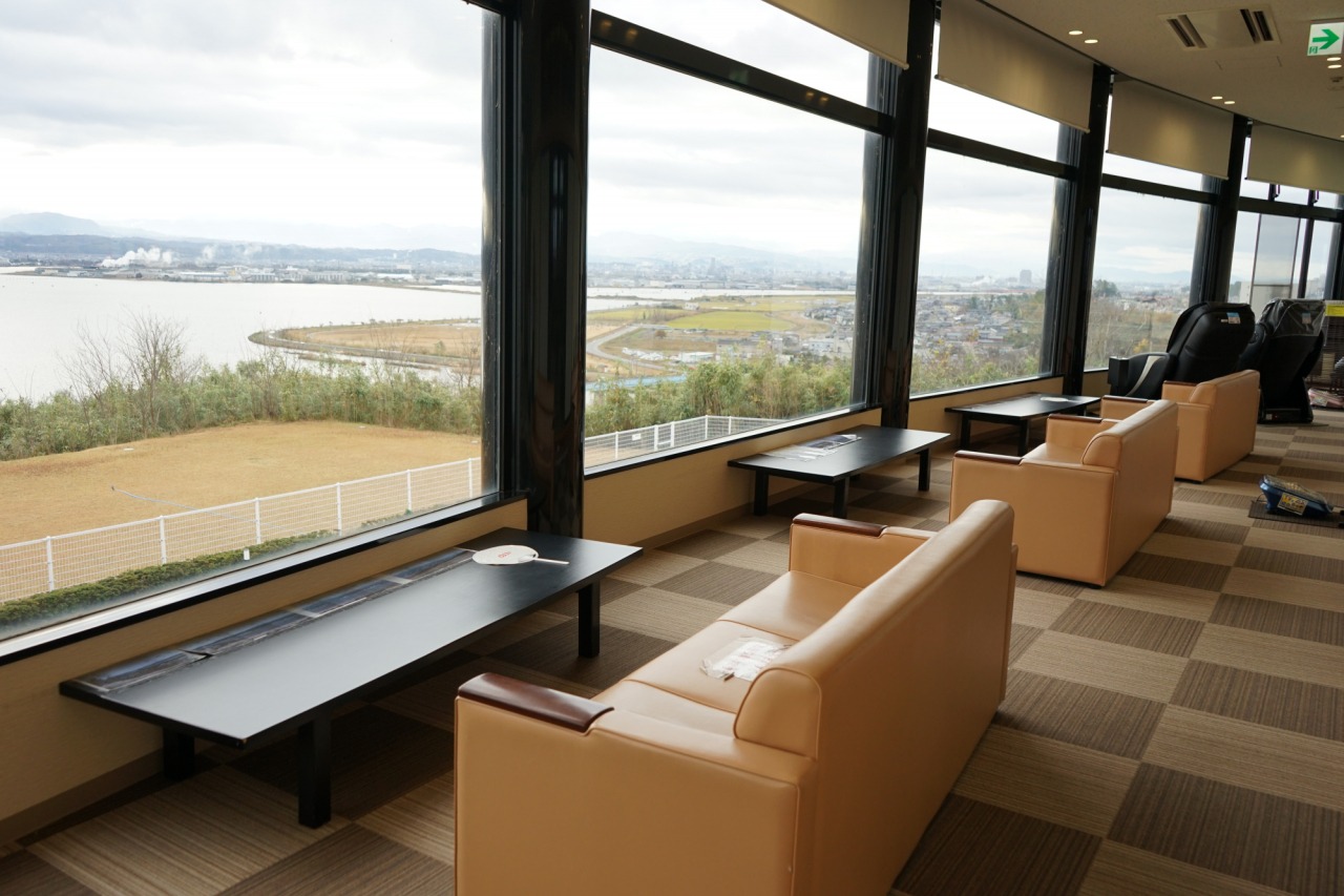 大きな窓が設けられ、目の前に広がる河北潟を眺めることができます。晴れた日には遠く白山や立山連峰も見渡すことができる、絶好のロケーション!
