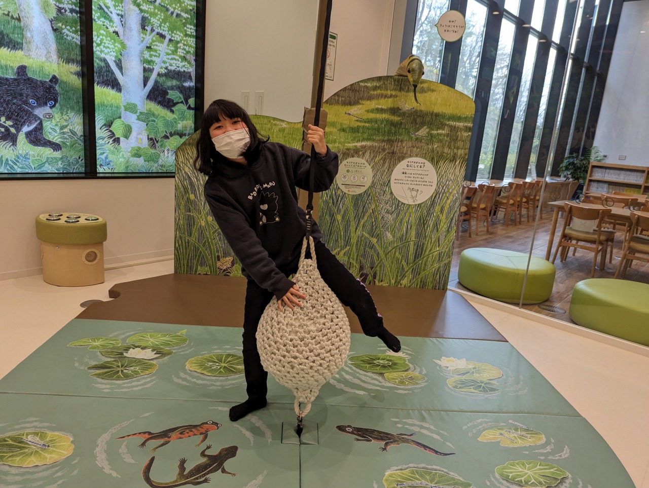 これは、能美市の秘境「蟹淵(がんぶち)」に生息しているモリアオガエルの卵を模した遊具です。