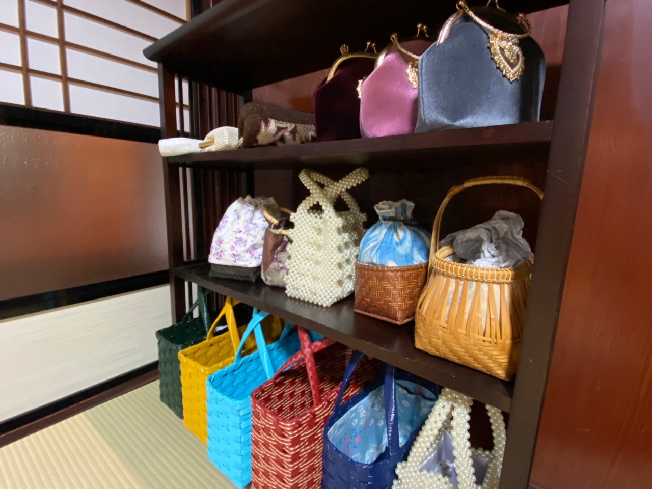 加賀市で染められた着物に合わせて、加賀市で作られたという下段の赤いかごバッグを選びました♩