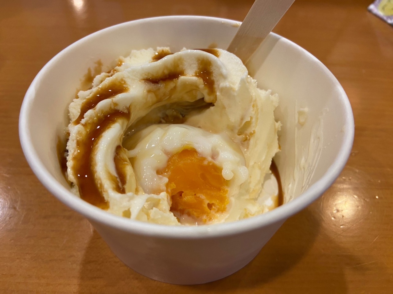 なんと温玉がソフトクリームの中央に鎮座しているではありませんか…。