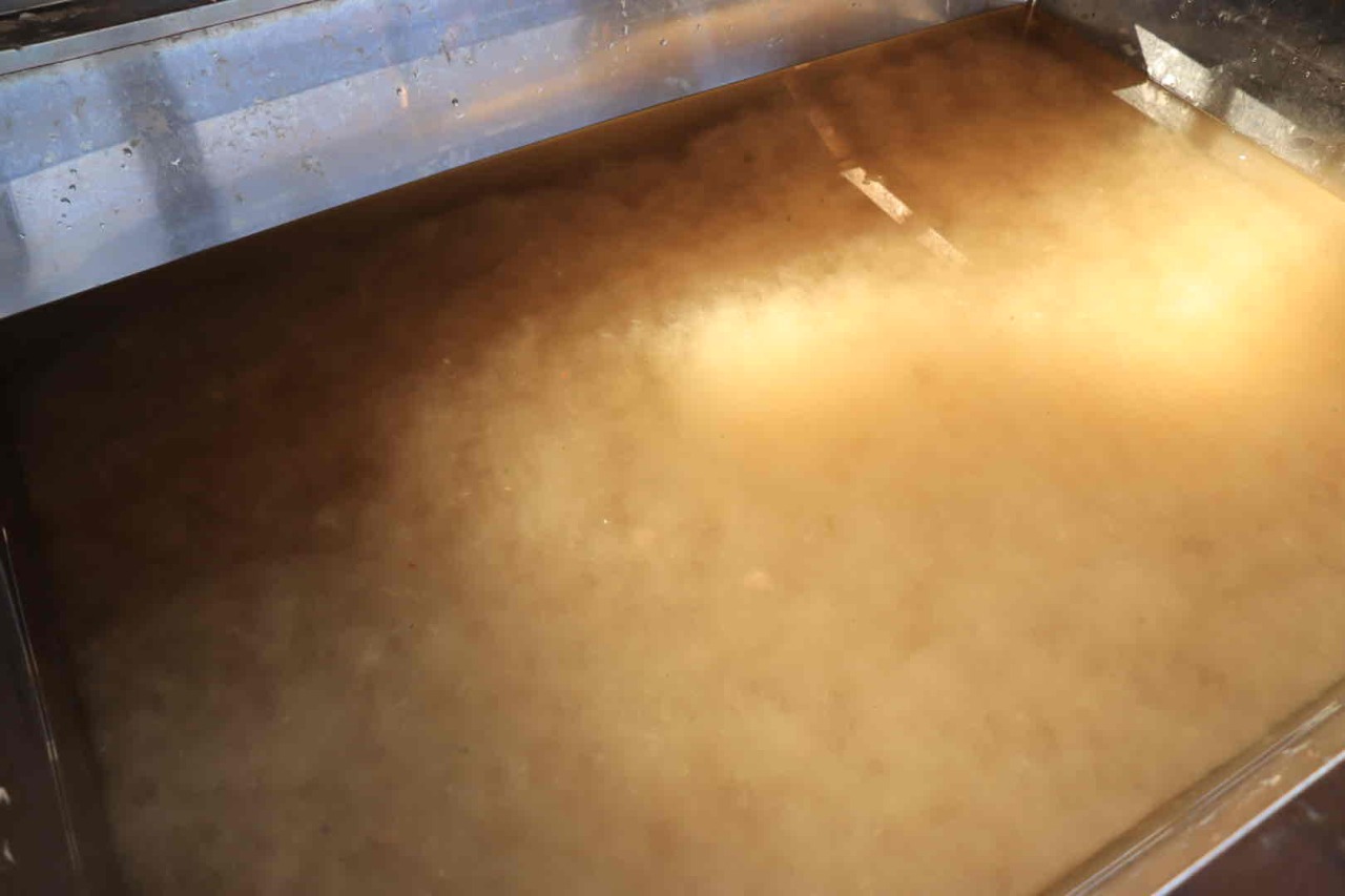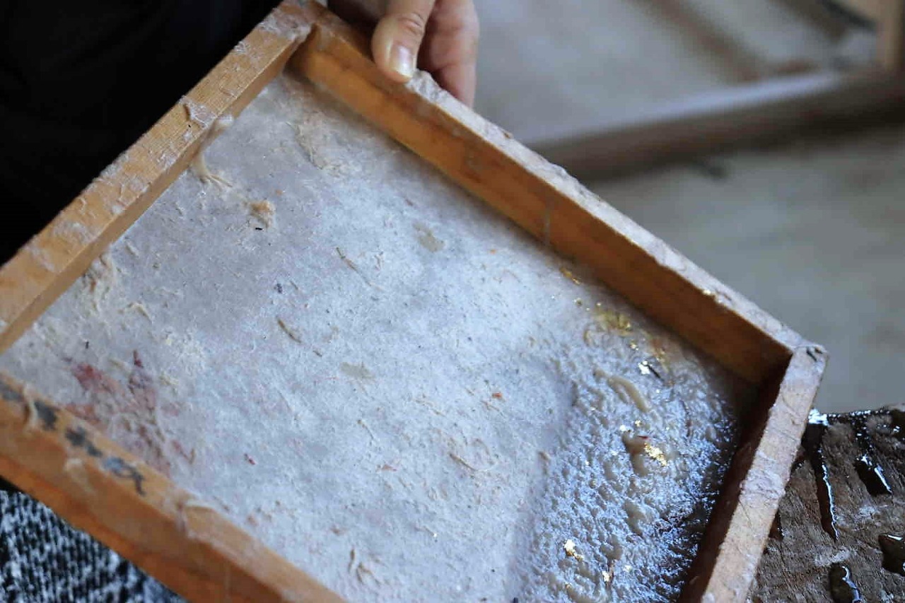 ドロドロになった繊維からゴミを取り除き「加賀雁皮紙」の原料ができあがりです。