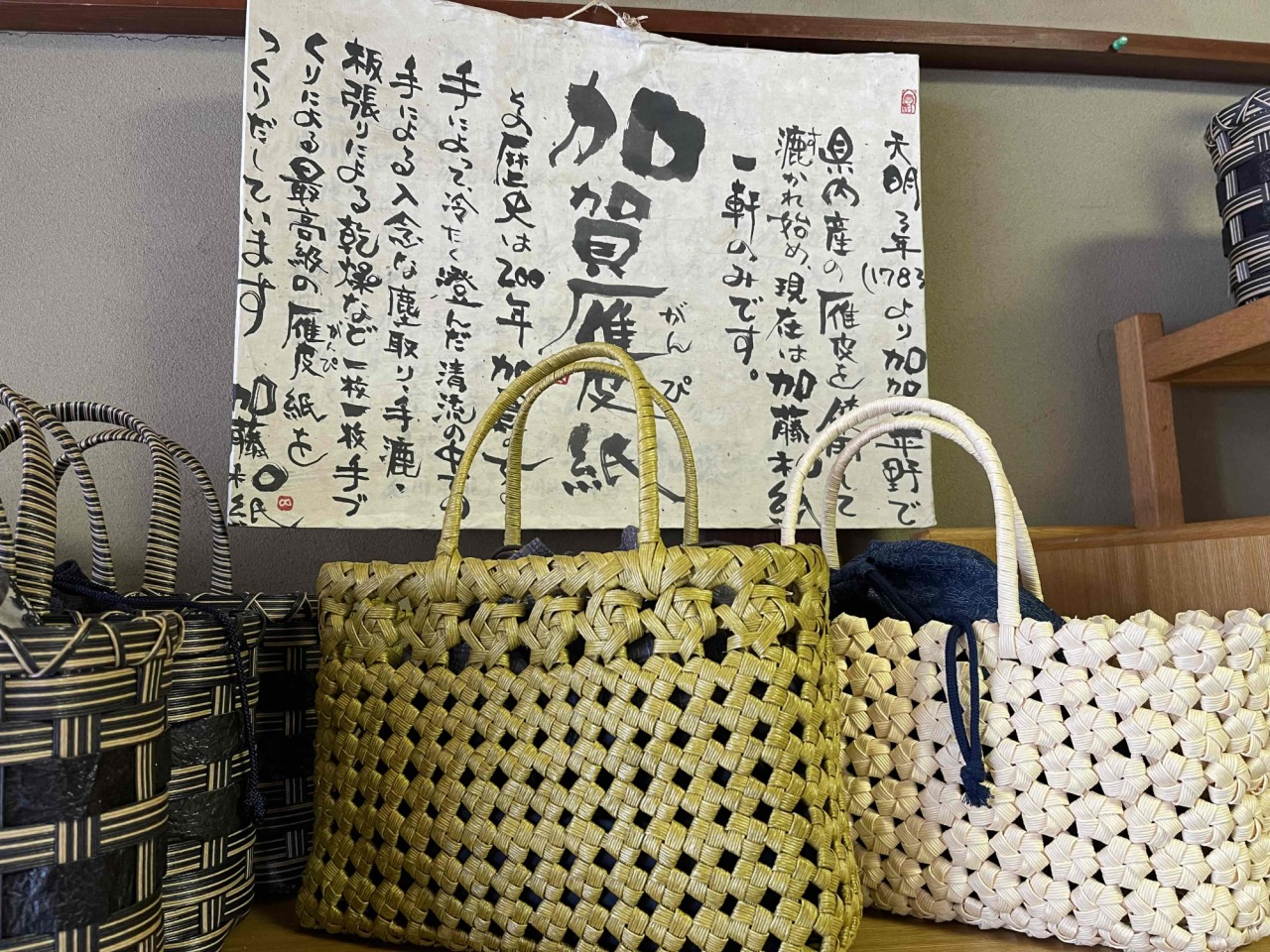 また、柿渋を使った柿渋雁皮紙でのお財布などの小物や洋服、置物、バッグの制作や、工房の向かいの建物で実物の販売もしていますよ。