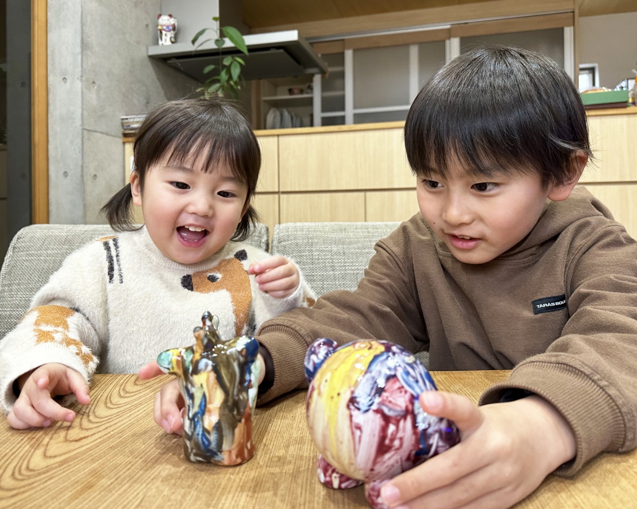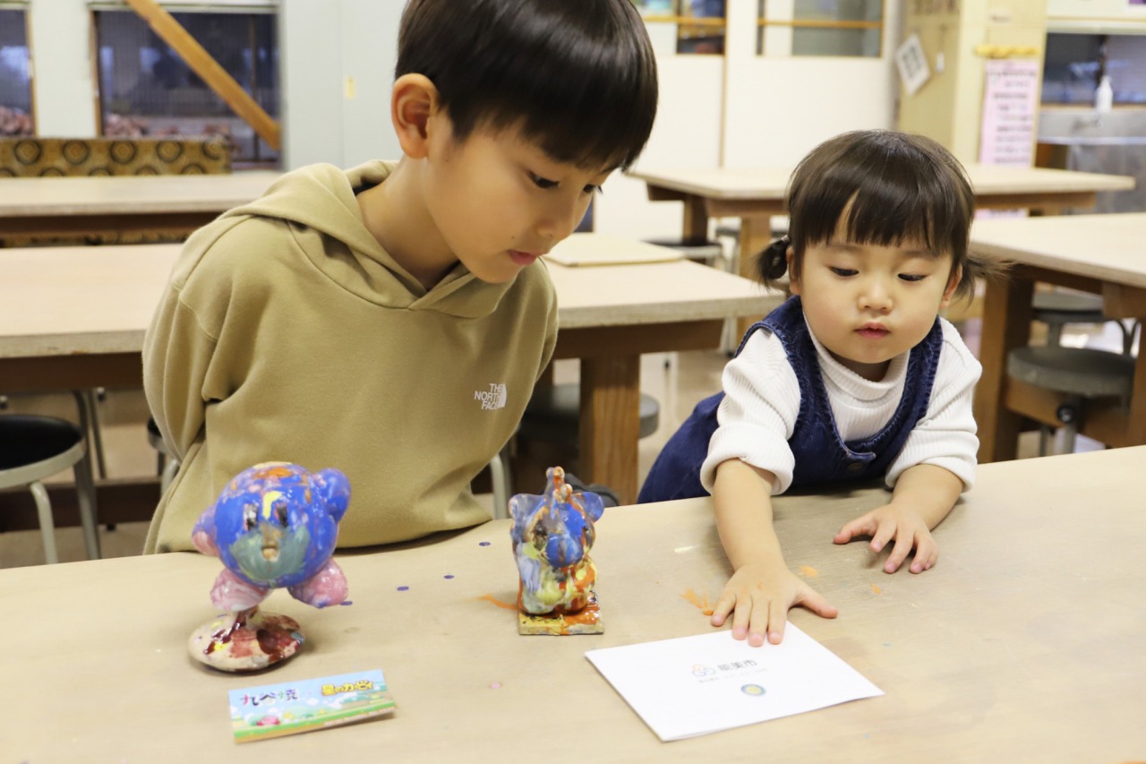 10日後くらいにカービィとブースカが焼き上がりましたと連絡がありました。早速取りに行き、絵付けをしてくれた2人に見せました!「ピカピカになったよ!」「ここは(こんな意図があって)この色を塗ったんだよ」と嬉しそうに話してくれました。2人にとってとてもいい体験になったようでよかったです!