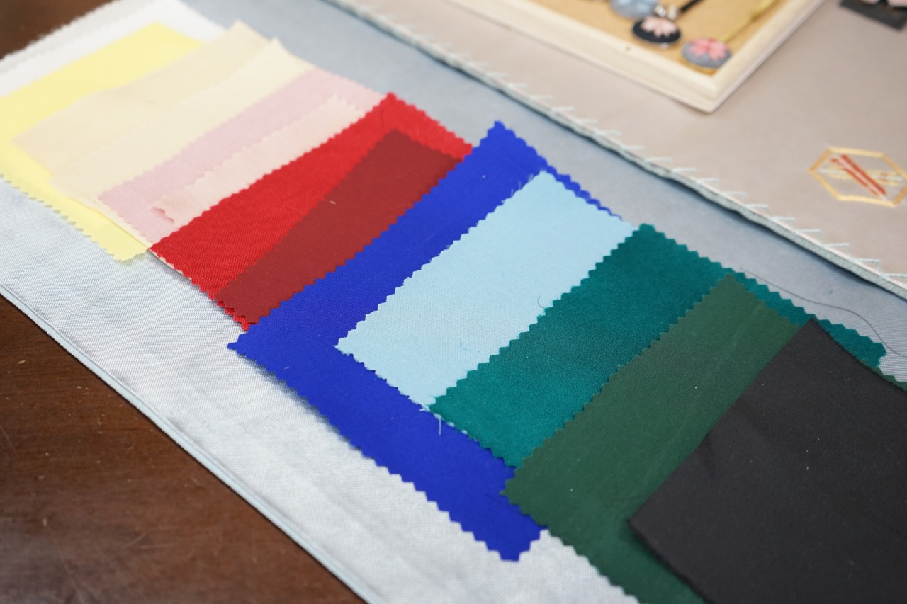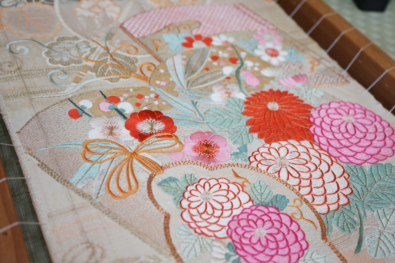 モチーフを2つ刺繍する必要があるので最大で3時間ほどかかるそうですが、袴や着物とのコーディネートにぴったりで、卒業式前の学生さんにも大人気の体験メニューなのだそうです。