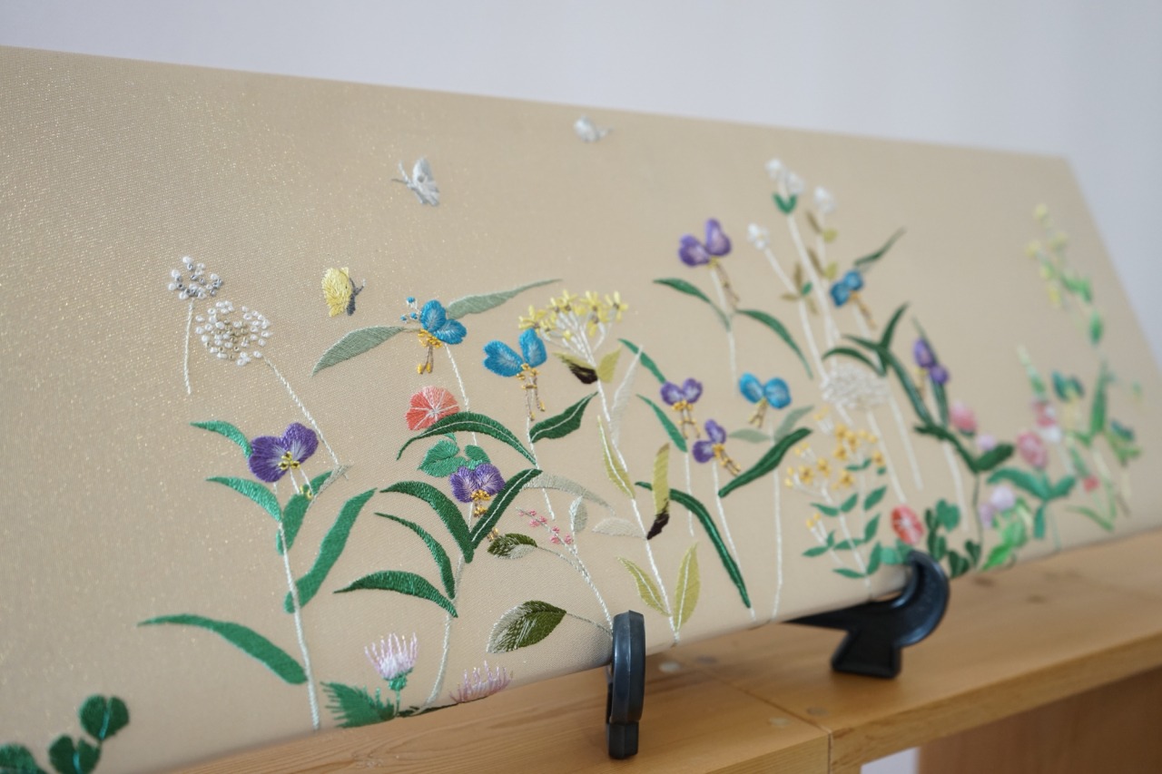 少し離れて見るとまるで絵画のようで、ひと針ひと針丁寧に描き出された模様の美しさに、うっとりと見とれてしまいます。