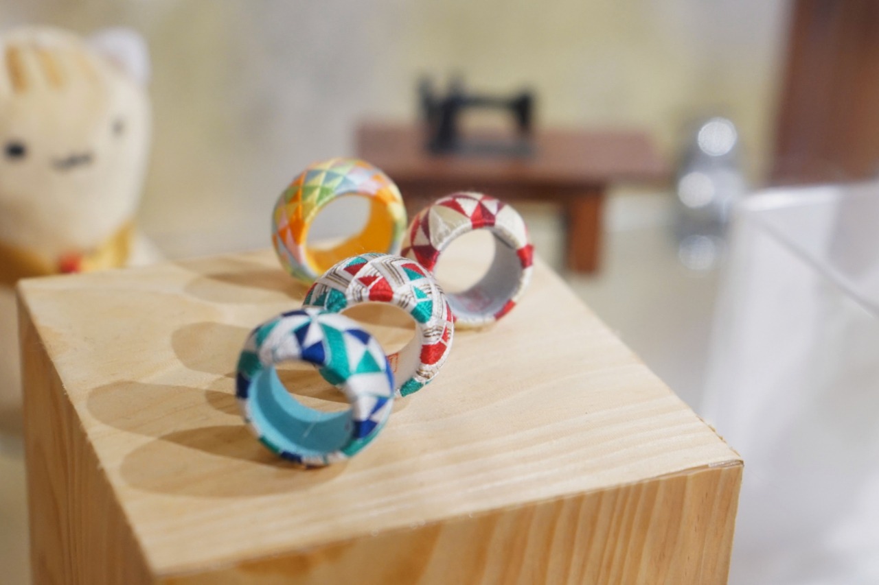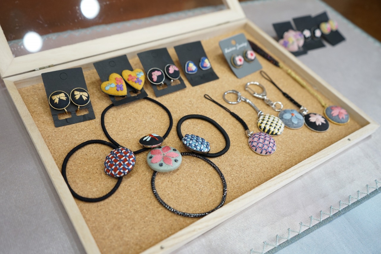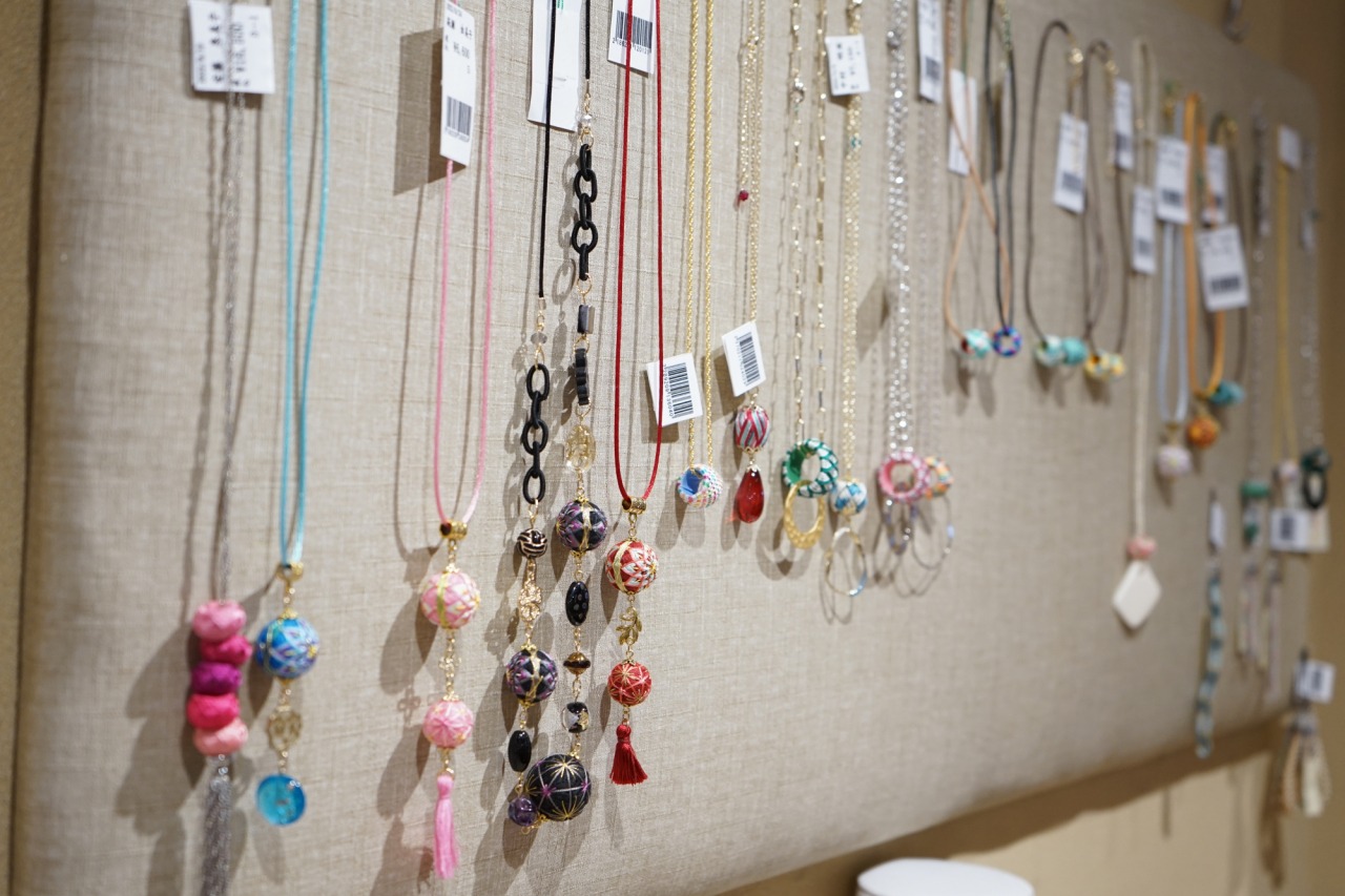 裁縫が楽しくなりそうな加賀てまりをモチーフにしたかわいい針山や、コーディネートのアクセントになりそうなネックレスなどのアクセサリーも並んでいました。