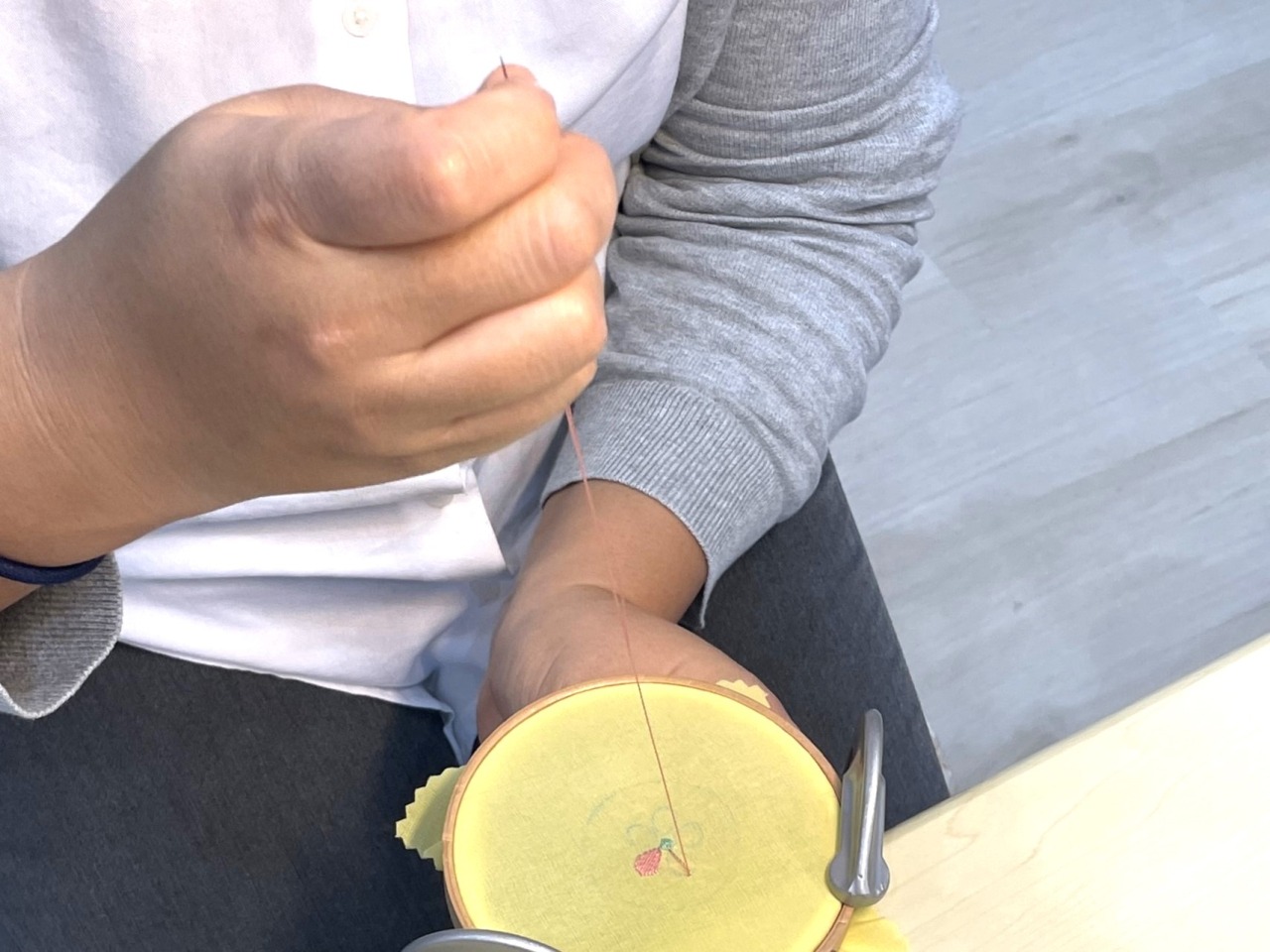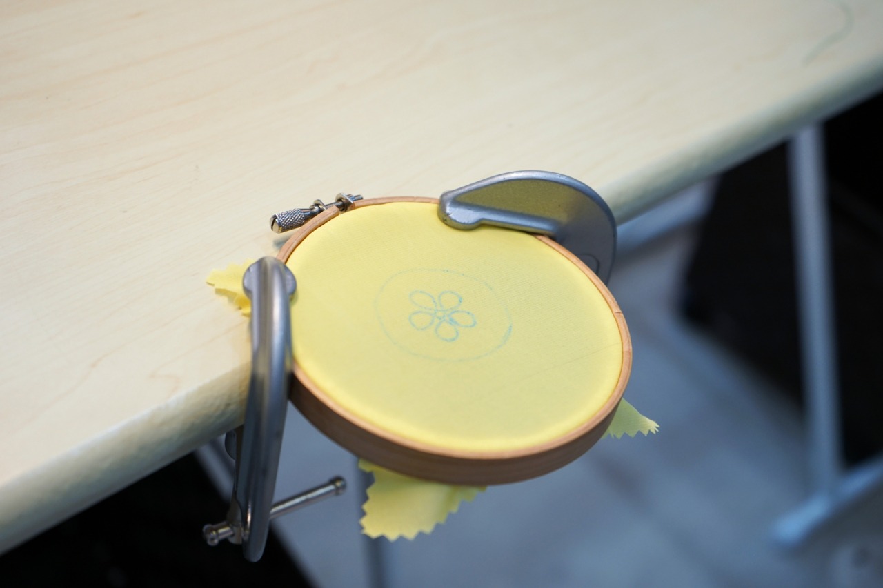 布にモチーフの下絵を描いてもらい、刺繍枠をテーブルに固定したら、さっそく縫っていきます!