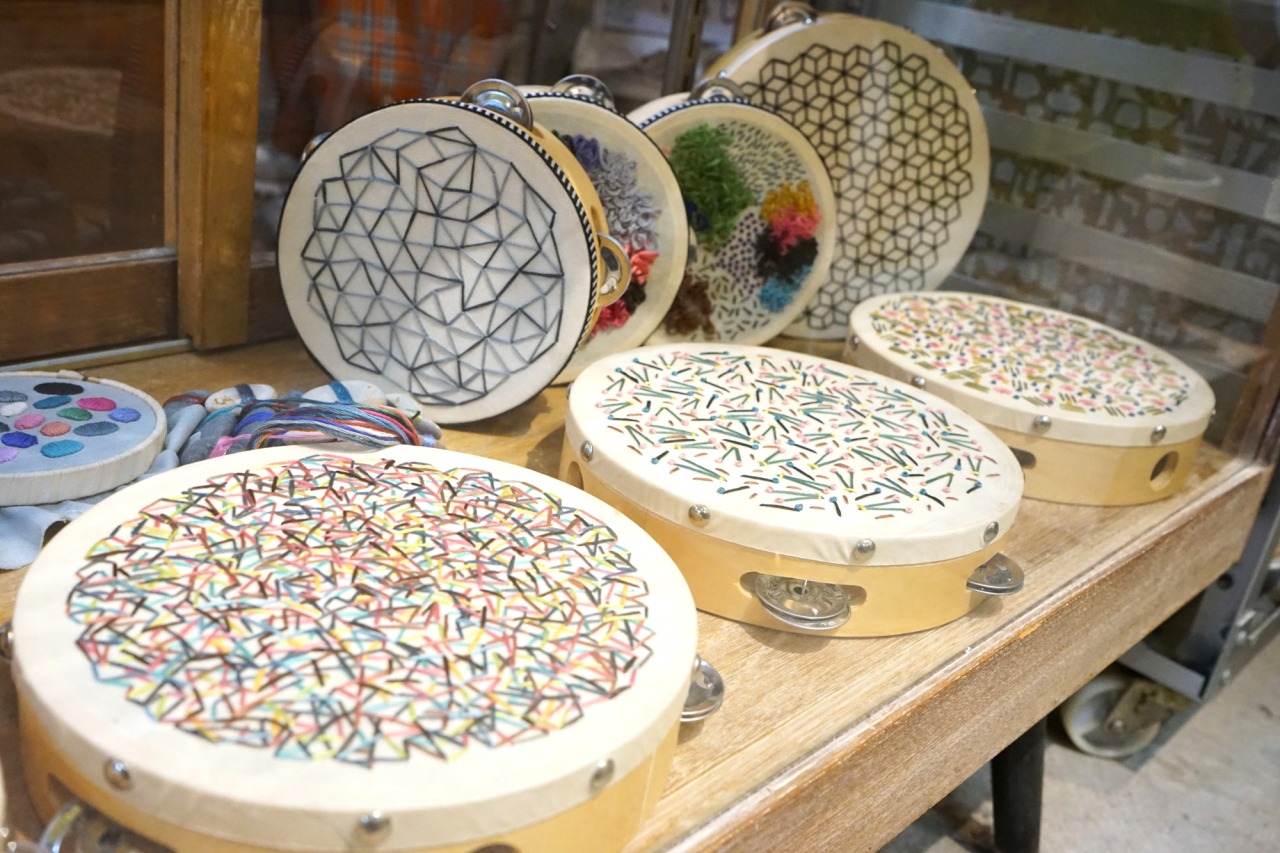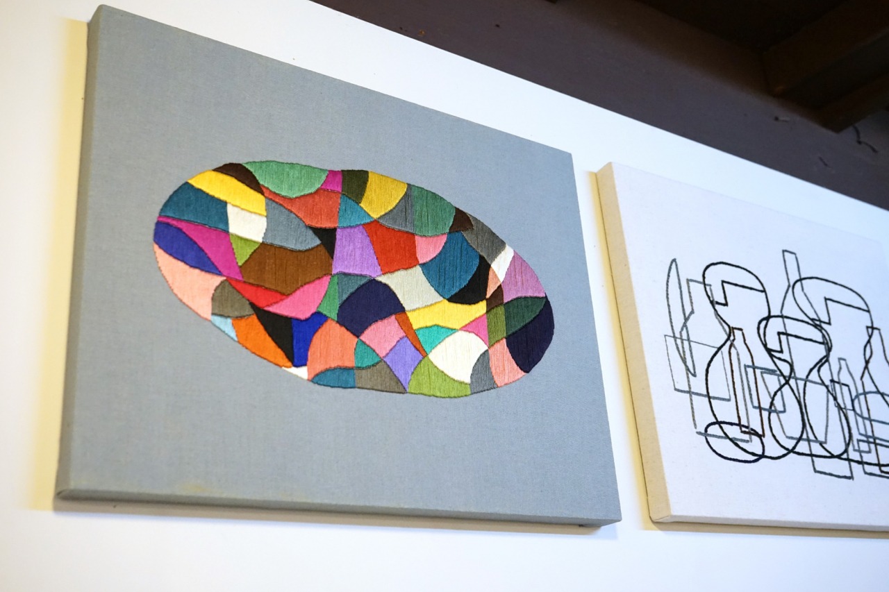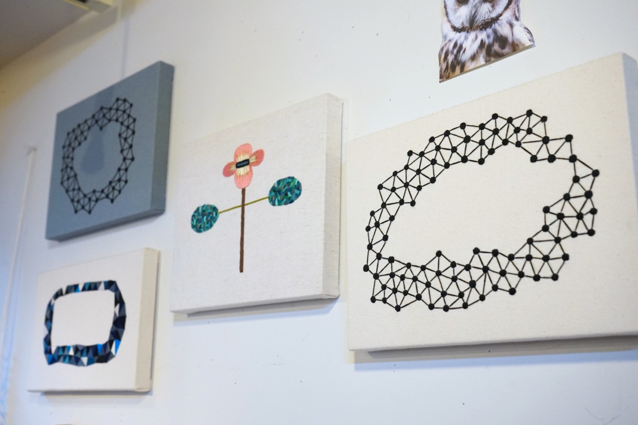 壁には、色鮮やかな糸で描かれた図形や花など、オリジナリティーあふれる作品がいっぱい!