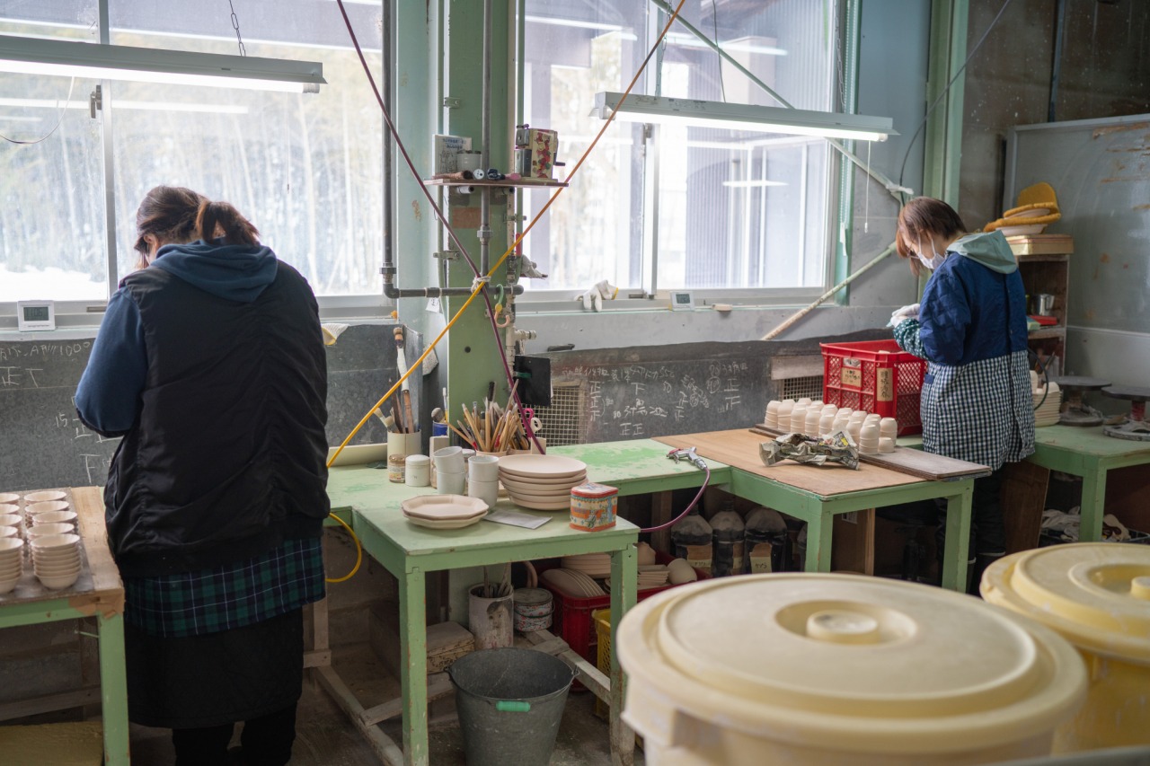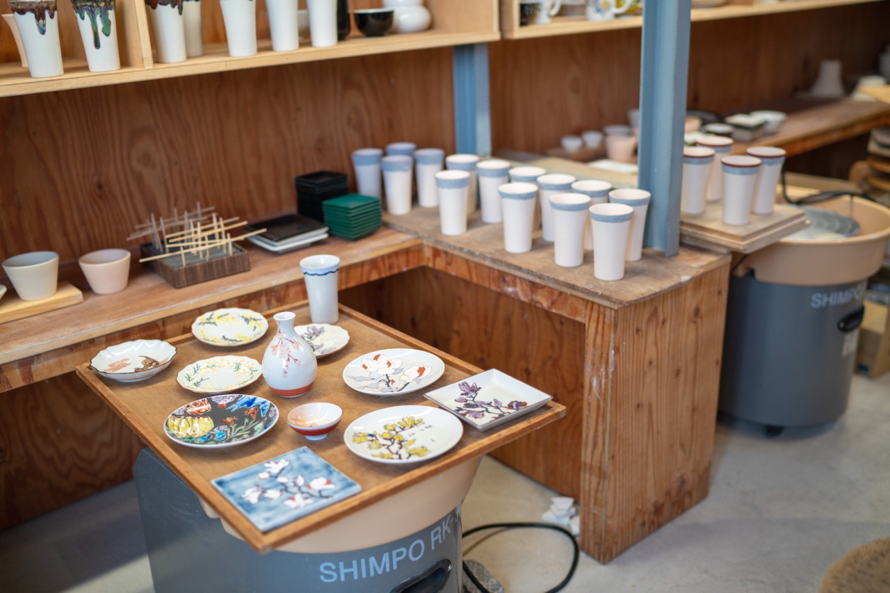 こちらでは、ろくろ体験や絵付け体験もしています。体験が無い時は商品開発もしているそうです。