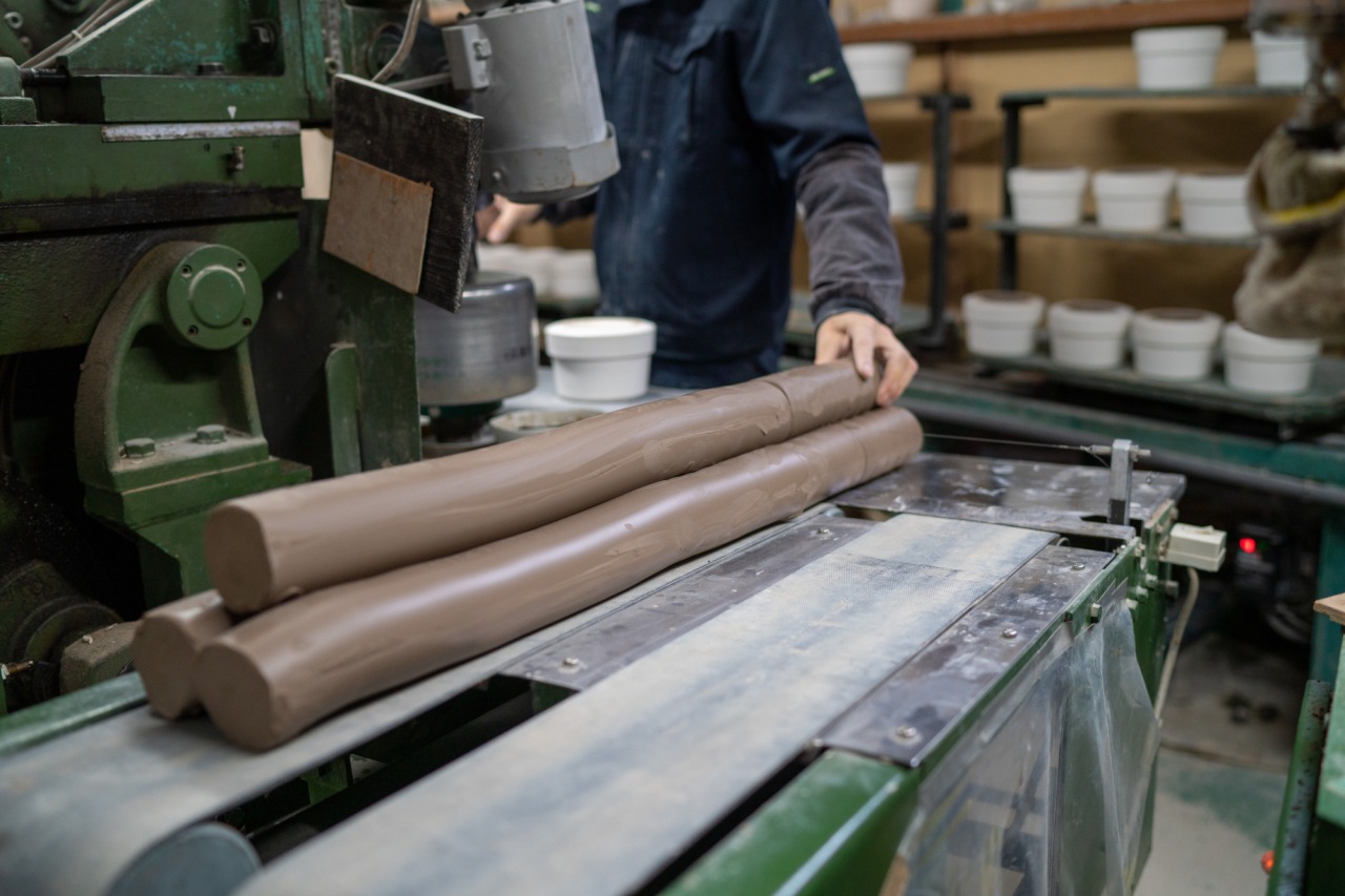 空気を抜いた棒状の粘土を一つ分ずつ切り分けて専用の型の中へ入れます。