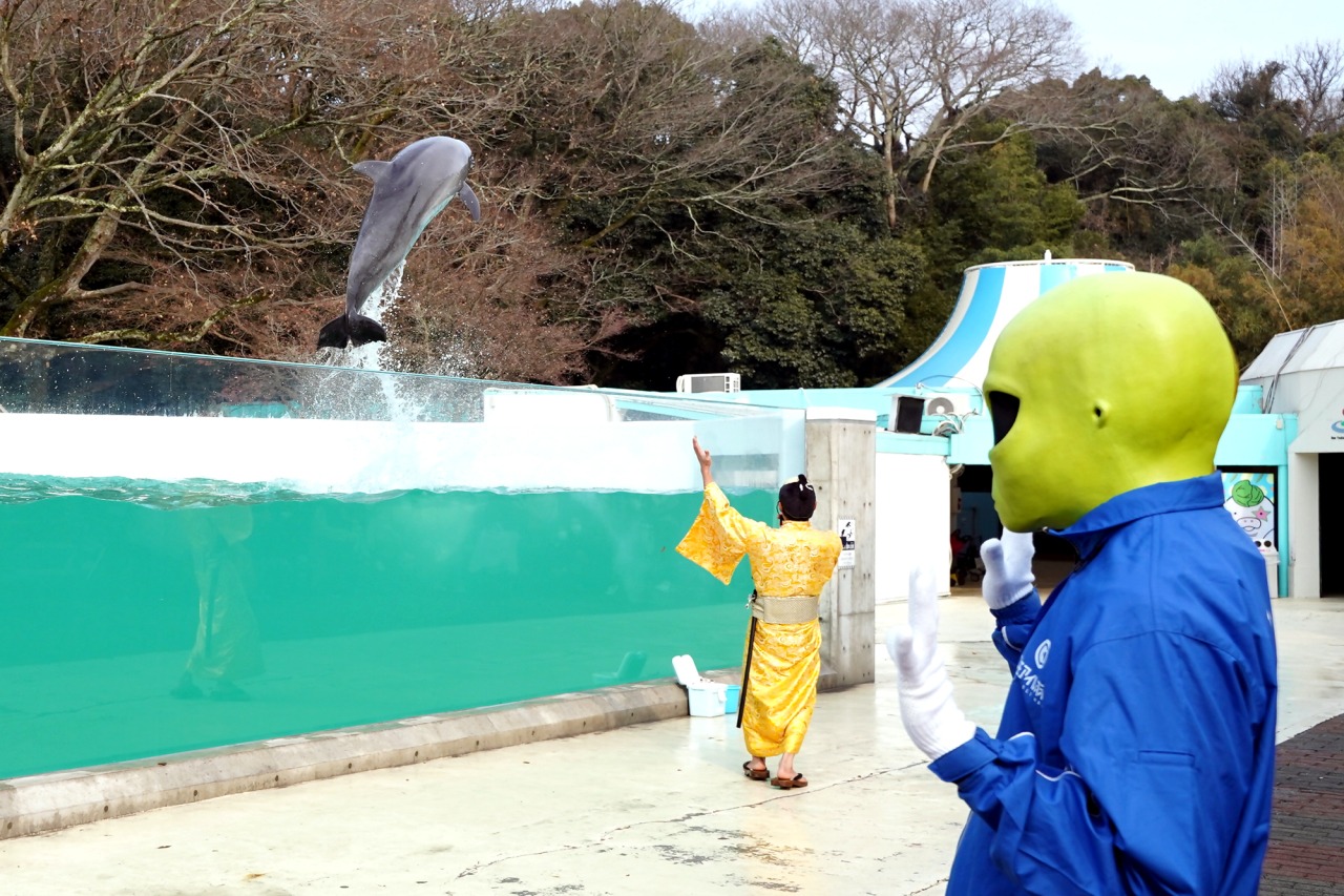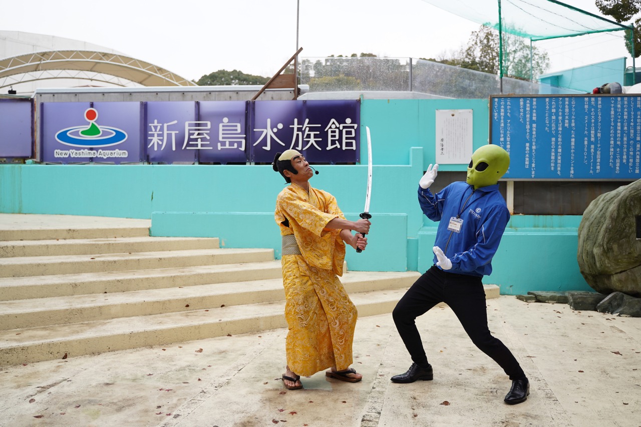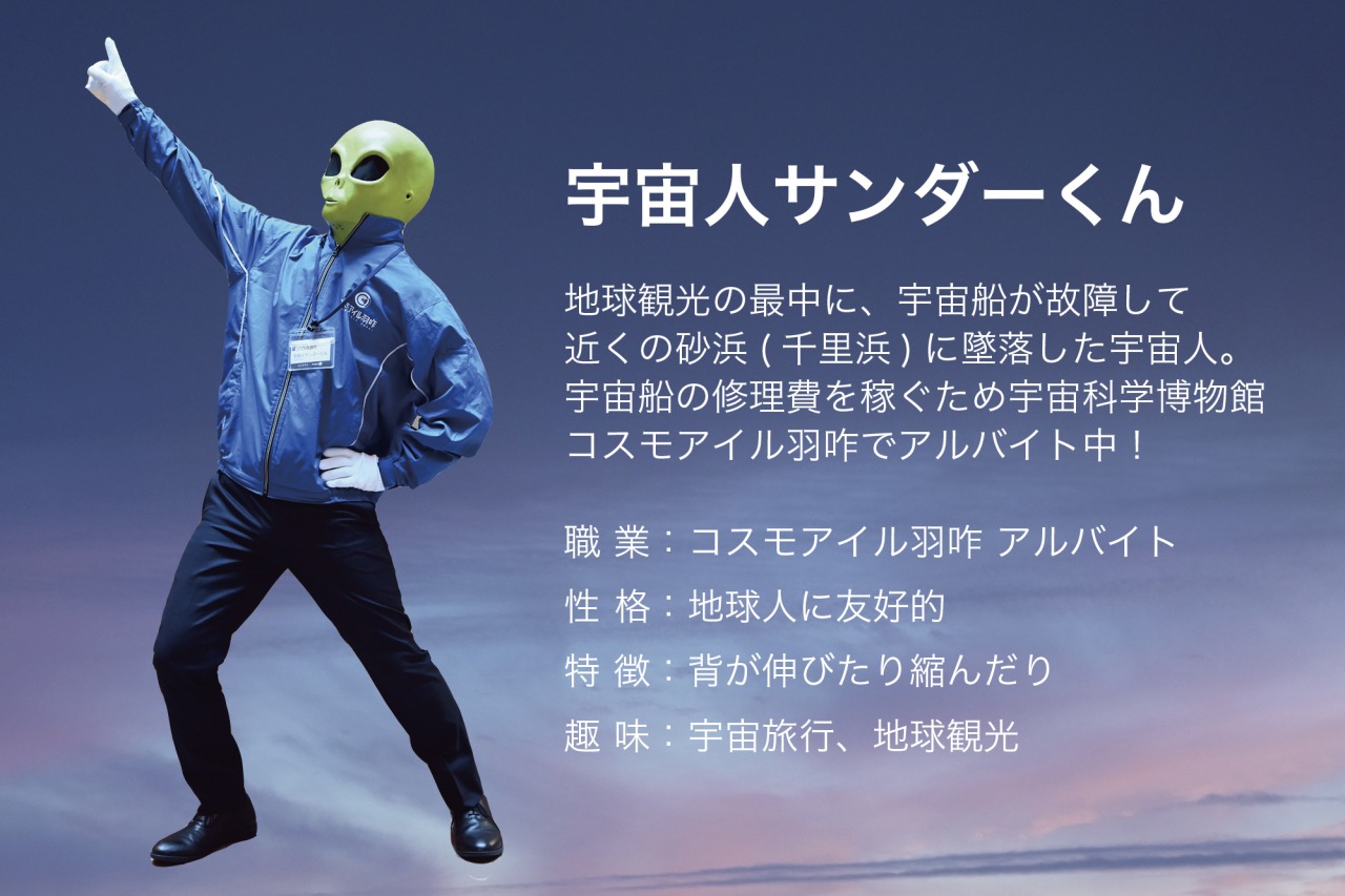 サンダーくん:ボクは石川県の「コスモアイル羽咋」で働いている宇宙人のサンダーです。香川県にオモシロイ水族館があると聞いて遊びに来ました。