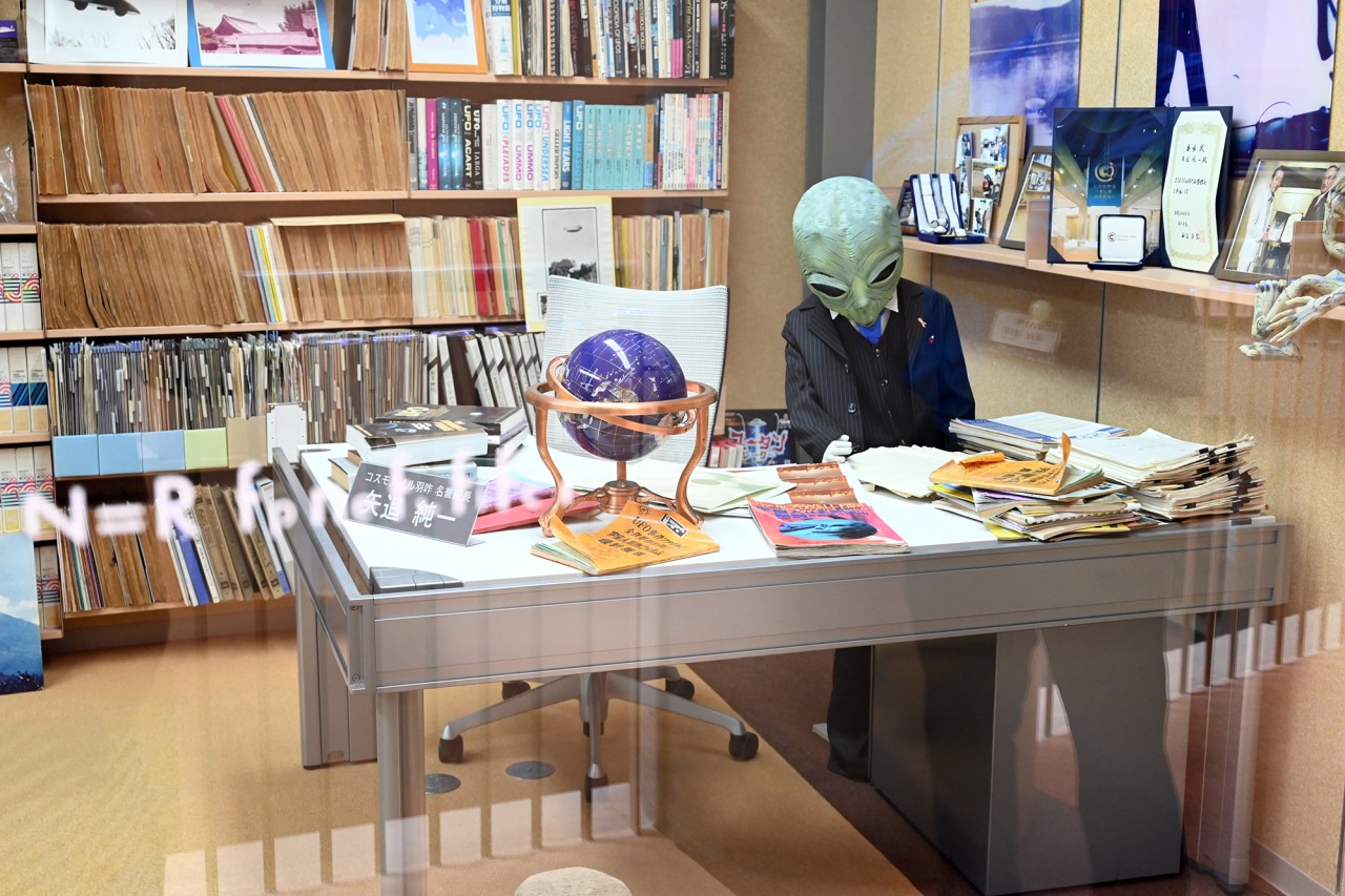 「コンニチハ! 外のロケット見ましたか? あれはNASAで宇宙船の打上げに使われた本物のロケットですヨ」と、出迎えてくれたサンダーくん。地球観光をしている途中で、すぐ近くの千里浜に乗っていた宇宙船が墜落してしまい、その修理費用を稼ぐために「コスモアイル羽咋」でアルバイトをしているそう。地球での暮らしにもすっかり慣れて、博物館のSNSの情報発信もお手のもの、石川県の観光にも詳しいと評判です。