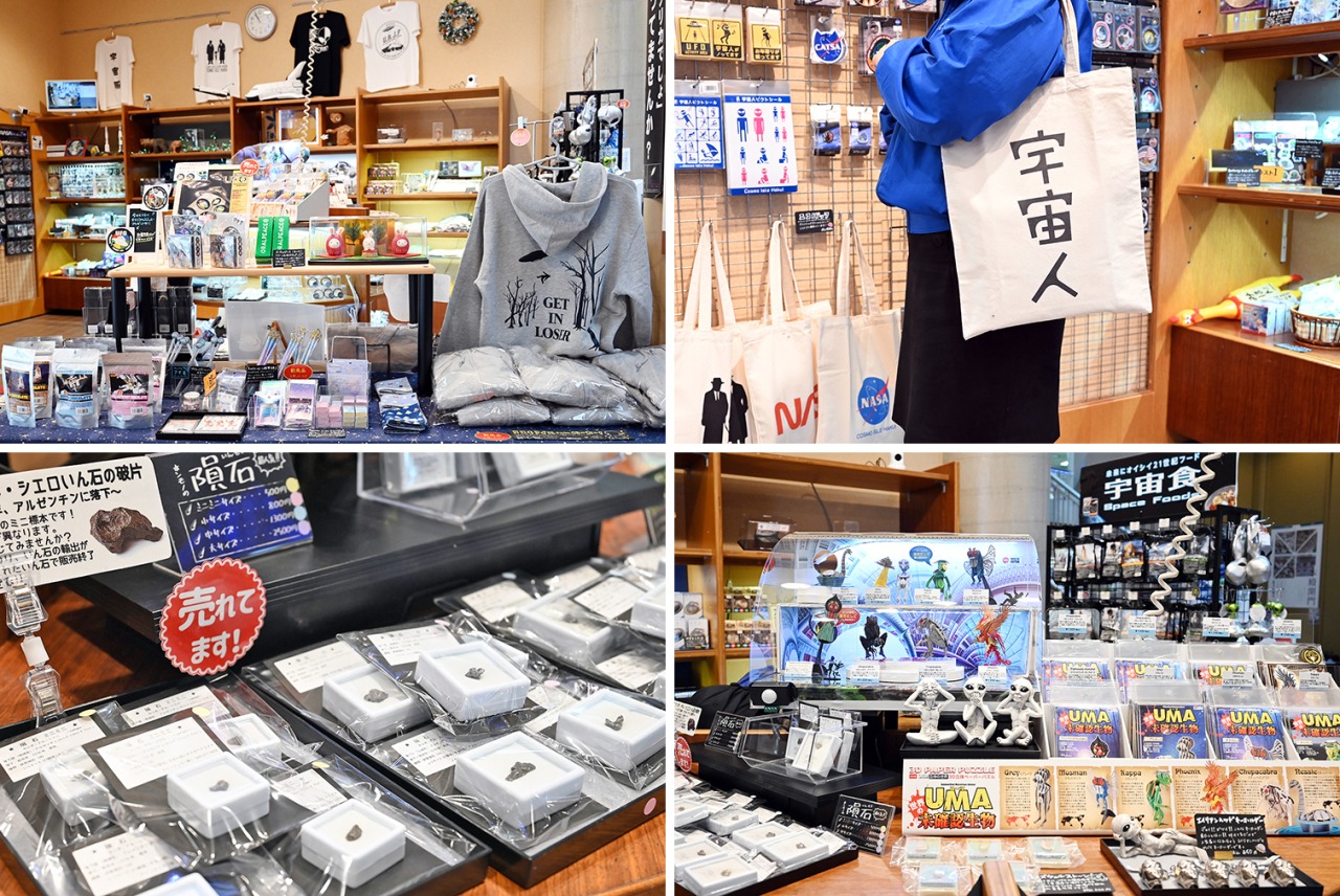 1階のミュージアムショップでは、宇宙食や隕石、ロケットやUMA(未確認動物)のフィギュア、トートバッグ、Tシャツなど、宇宙に関連したお土産が販売されています。「地球の宇宙食はとても美味しいです。ボクのオリジナルグッズもオススメです」とサンダーくん。