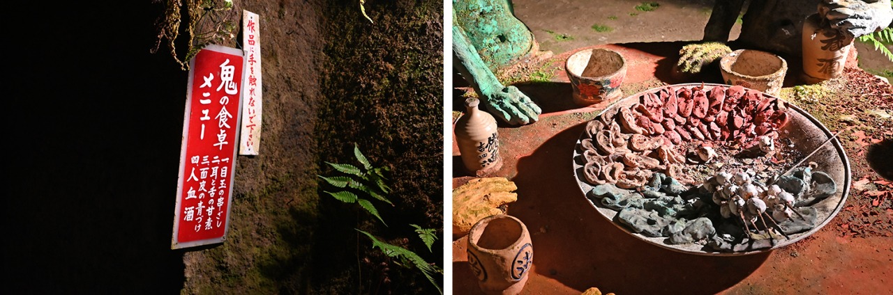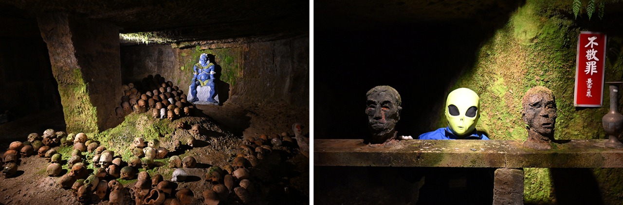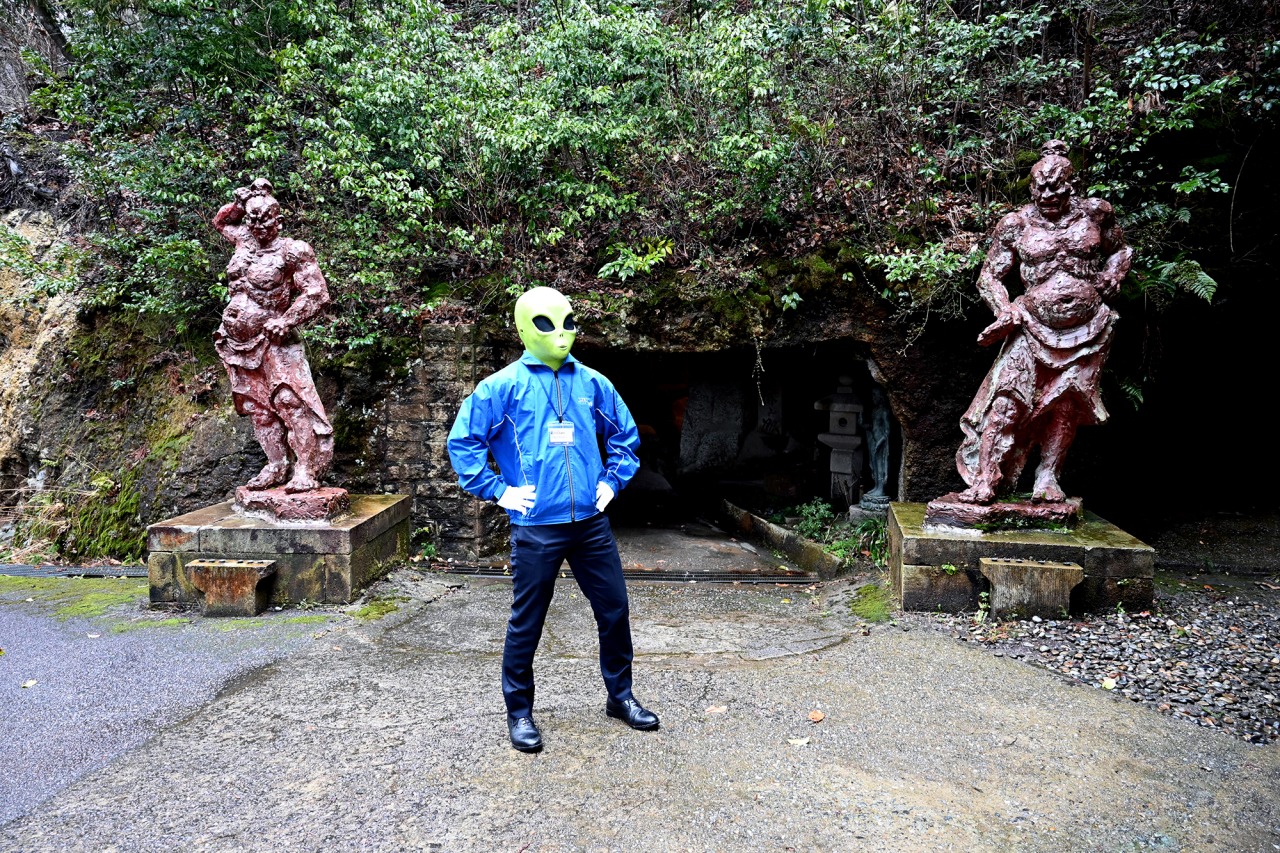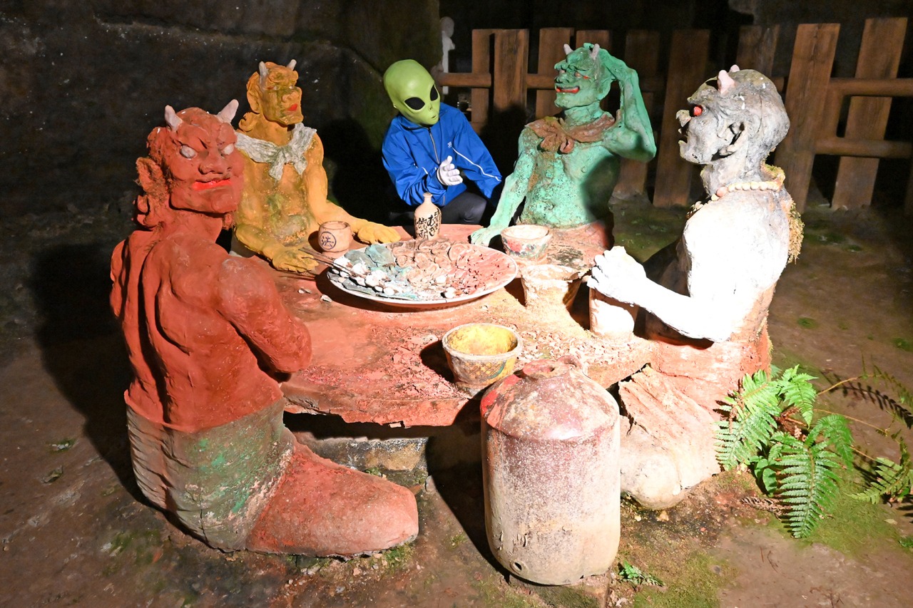 「な〜んていう妄想も膨らんで、ハニベ巌窟院はユニークな映え写真もたくさん撮影できます。地獄巡りや独特の世界観を体験できるのは、芸術家が創り上げた超リアルで本気の作品があってこそ」とサンダーくん。