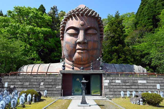 「ハニベ巌窟院」は、初代院主で彫塑家の都賀田勇馬(つがたゆうま)さんが、かつて石切り場だった洞窟をアトリエにして製作した仏像や塑像などを安置・公開。2代目院主の都賀田伯馬(はくま)さんによる日本一の大仏造りが進められ、仏頭だけが完成しています。ちょっと変わったネーミングは、埴輪(はにわ)などを作る土師部(はじべ)に由来し、彫塑家が作った洞窟の寺を意味しています。