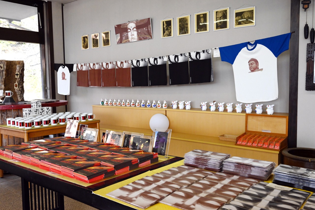 駐車場横の売店では、ハニベ大仏のTシャツ、ハニベ地獄めぐりの写真集(ポストカード)、手ぬぐい、マグカップのほか、福助や干支の置物などのハニベ焼きも販売されています。