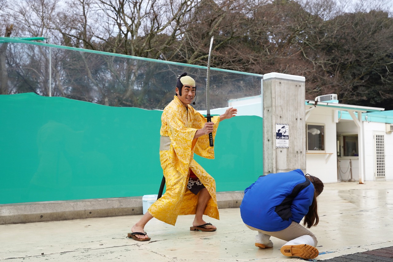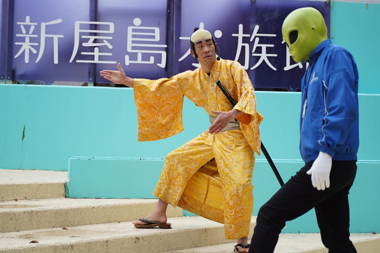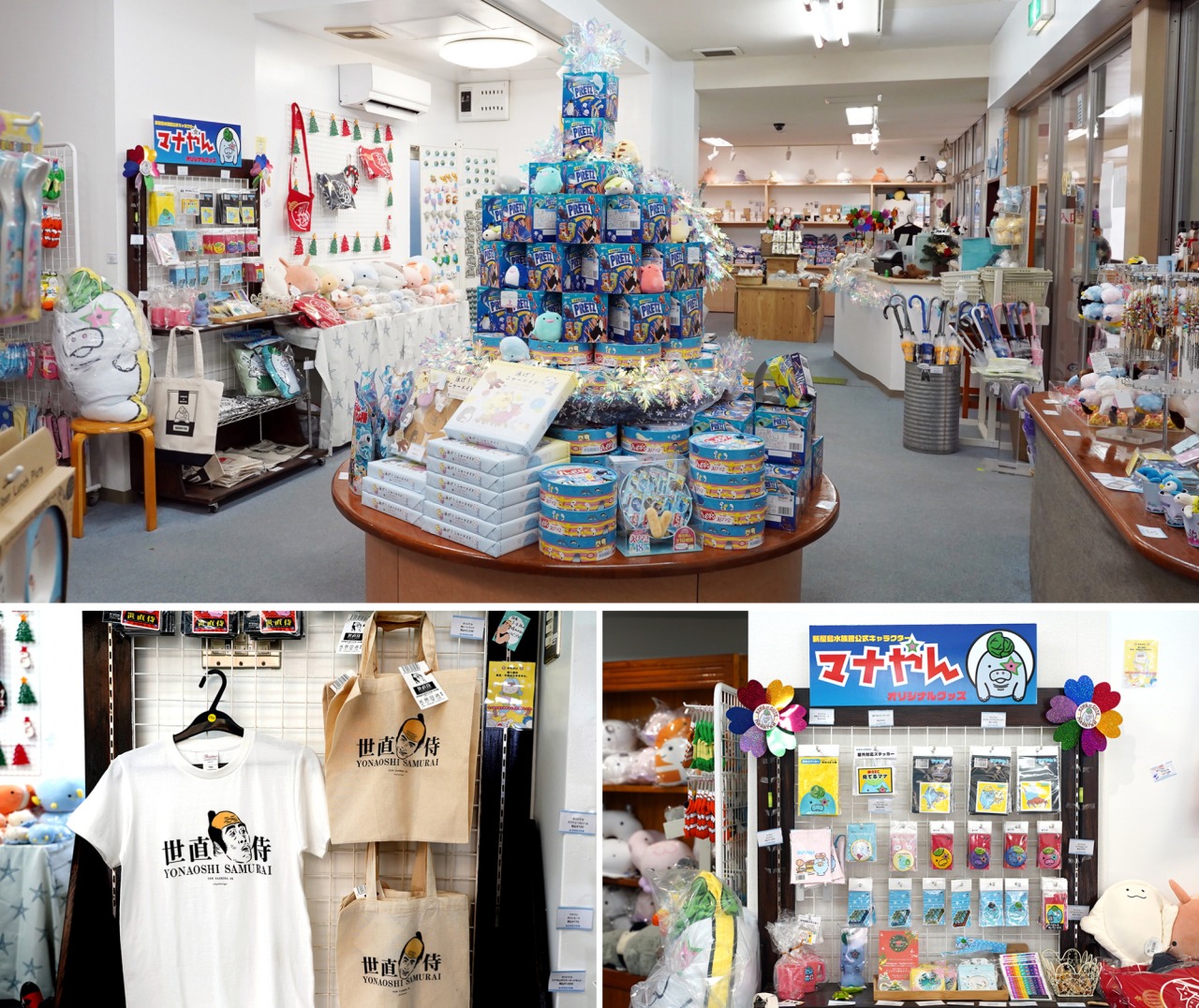 土・日曜と祝日のみ開催の「イルカ劇ライブ」を堪能した後はグッズ売り場へ。そこで「新屋島水族館」公式キャラクター「マナやん」のオリジナルグッズと並んで、「世直し侍」のTシャツやバッグなども発見!