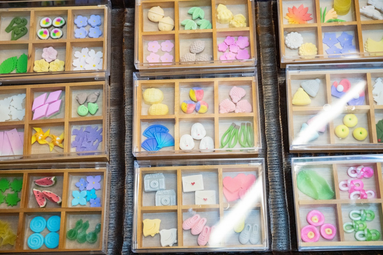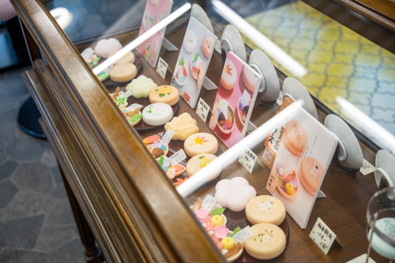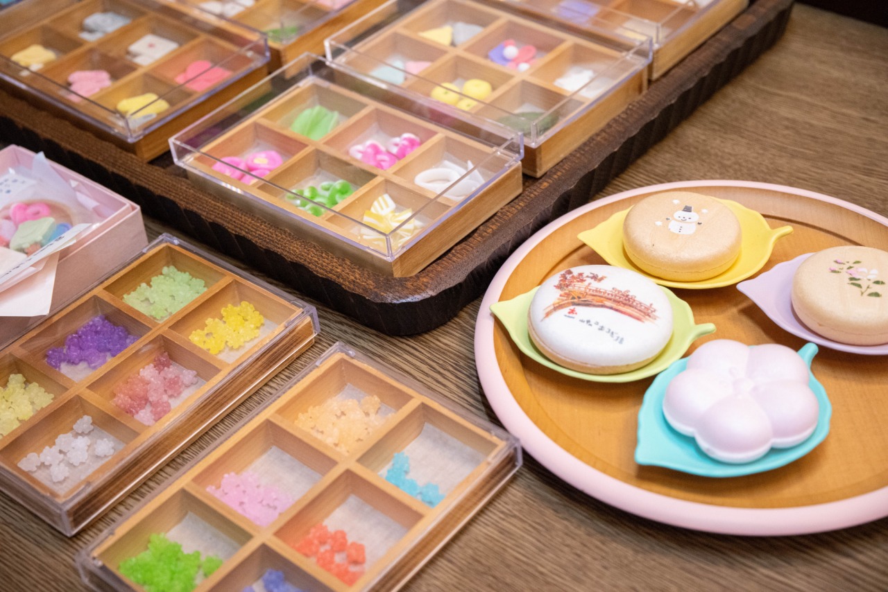 最中種の中には色鮮やかで可愛らしい様々な種類の干菓子と占いの札を入れます。ケースの中にはたくさんの干菓子が並んでおり、「この中から干菓子を6つ、金平糖を3つ、札を1枚選んで最中種の中に入れてくださいね」とのこと。