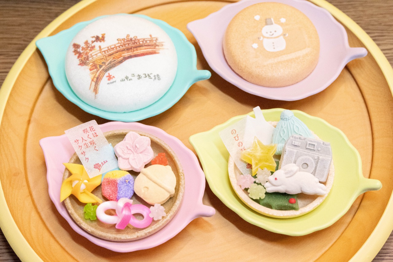 写真右の最中は、冬の時期限定の雪だるまの絵が描かれた「ゆきふわり」。その中に、冬の季節感を感じるモチーフの干菓子と、趣味のカメラや今年の干支のウサギを詰め込みました。