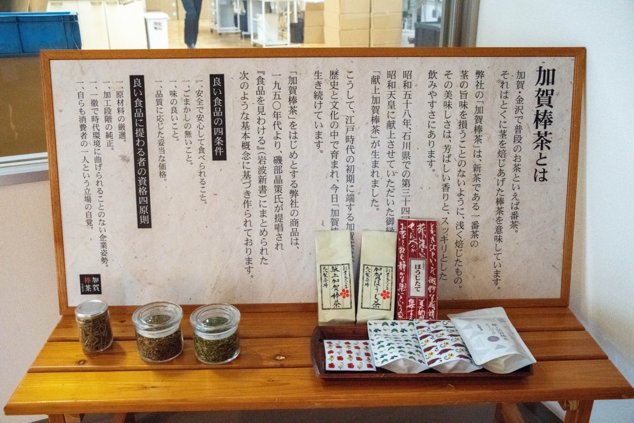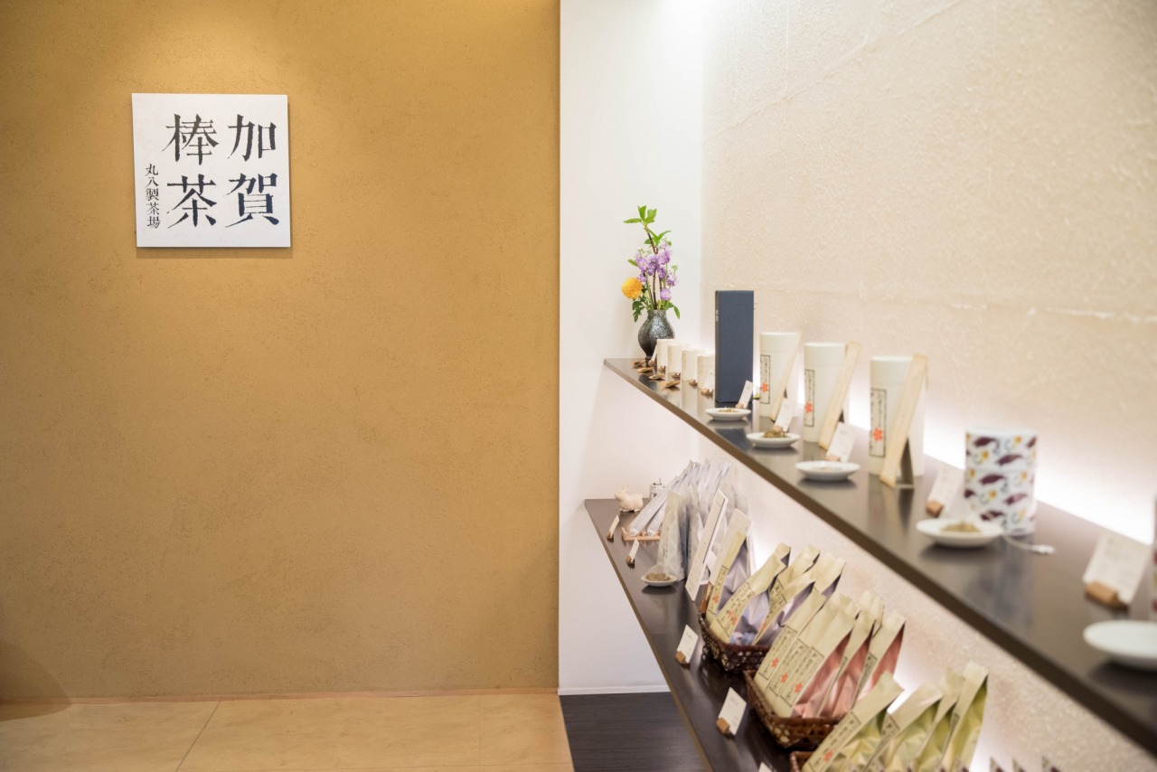 製造工場に併設された直営店「実生(みしょう)」には、喫茶スペースやギャラリー、物販コーナーなどがあり、飲んで見て買って、加賀棒茶を楽しめます。