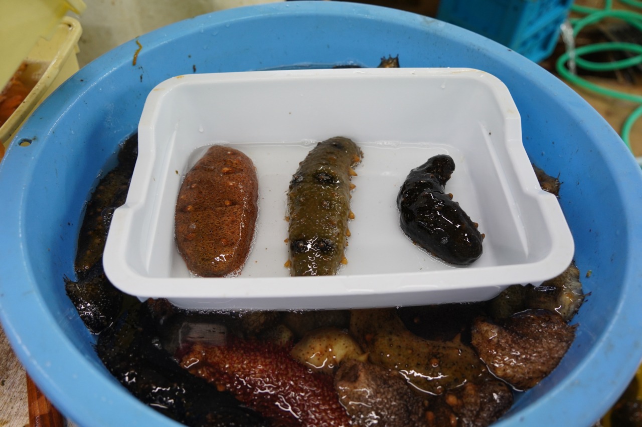 この七尾湾で食用として水揚げされるナマコは主に3種。写真左から、赤ナマコ、青ナマコ、黒ナマコで、それぞれに身のやわらかさや味わいが若干異なると言います。