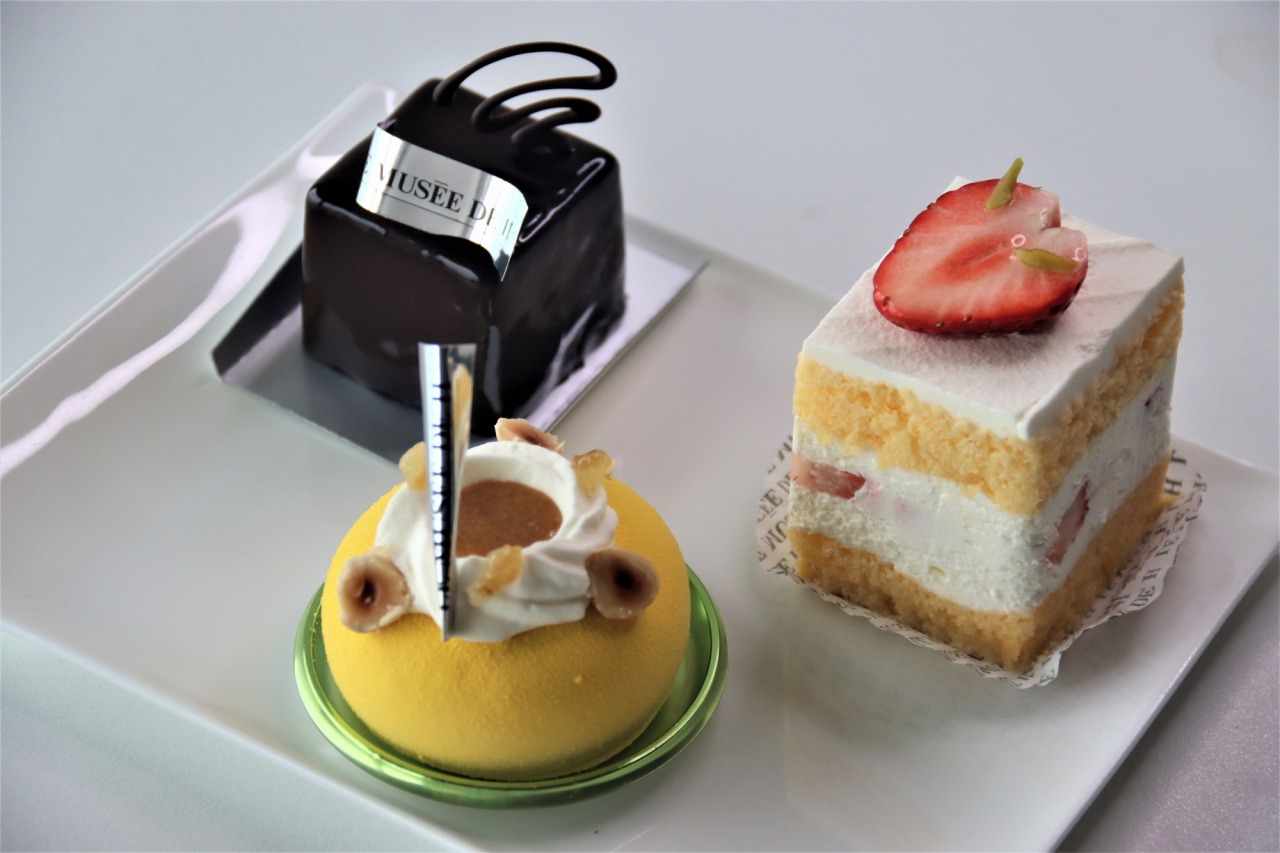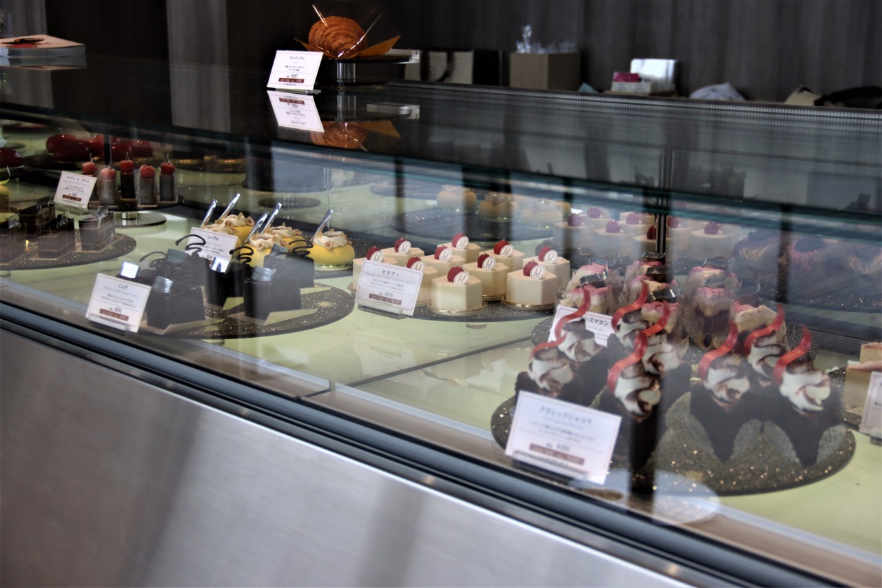 開店当初から人気のミュゼ(左:594円)をはじめ、レモンのムースのエーグル(中:648円)、能登のミルクと卵を使うセゾン・ド・ガトー(右:594円)などのフレッシュケーキのほか、焼き菓子やバウムクーヘン、チョコレートなどもそろいます。手みやげ用としてテイクアウトもいいですね。