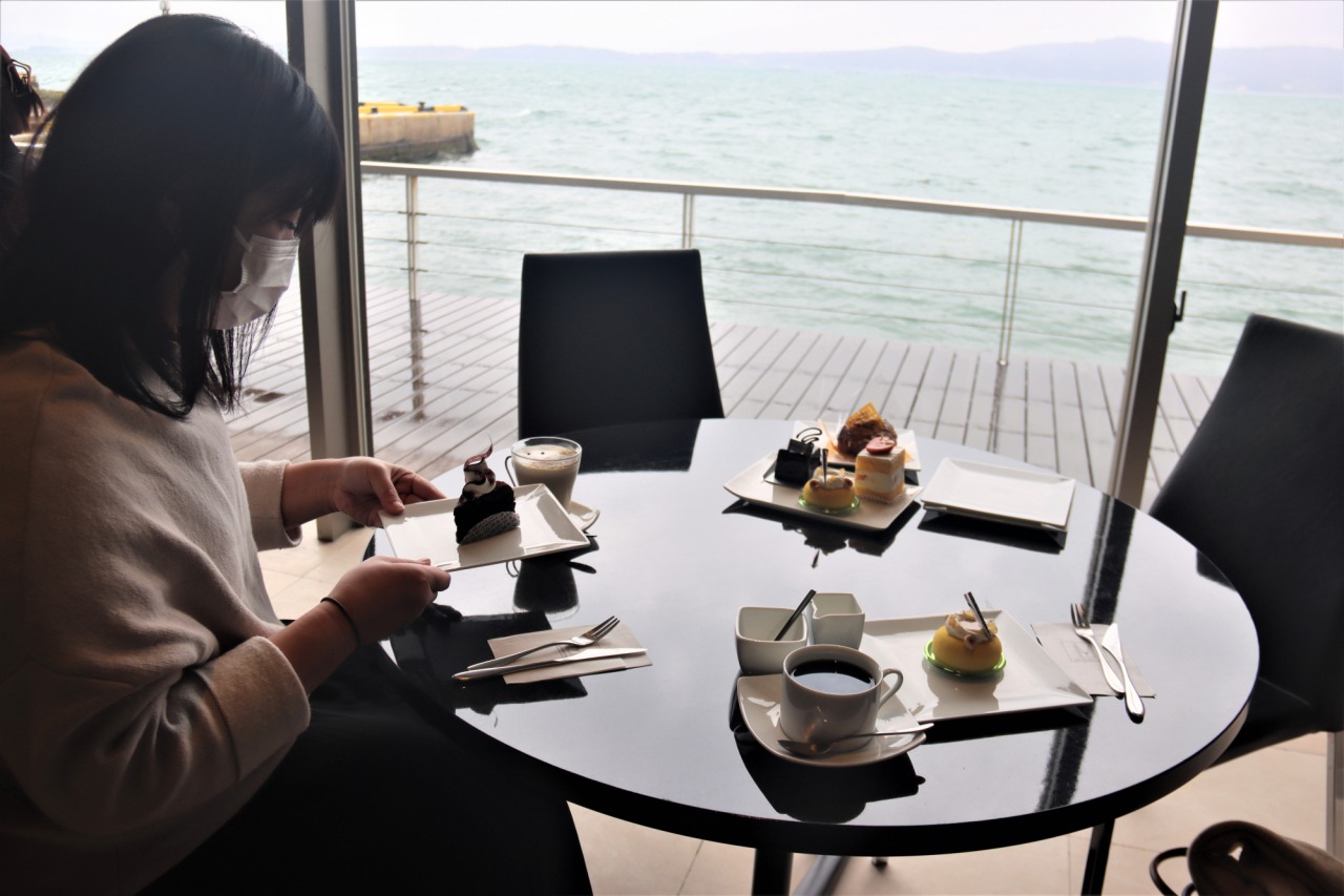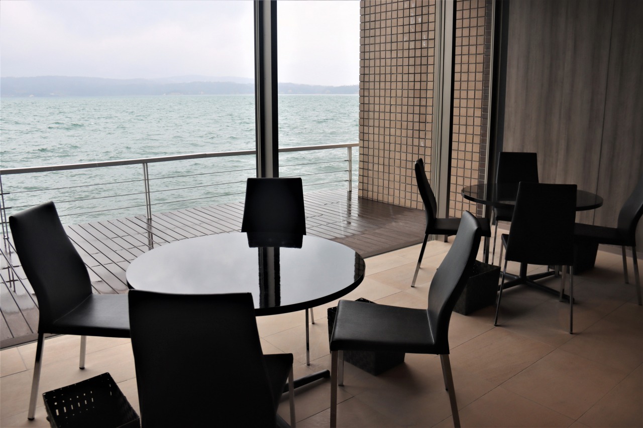 カフェは七尾湾に面していて、店内の大きなガラス窓からは海を一望。運よく、七尾湾の向こうにゆったり横たわる能登島も見渡せる窓際の席が取れました。