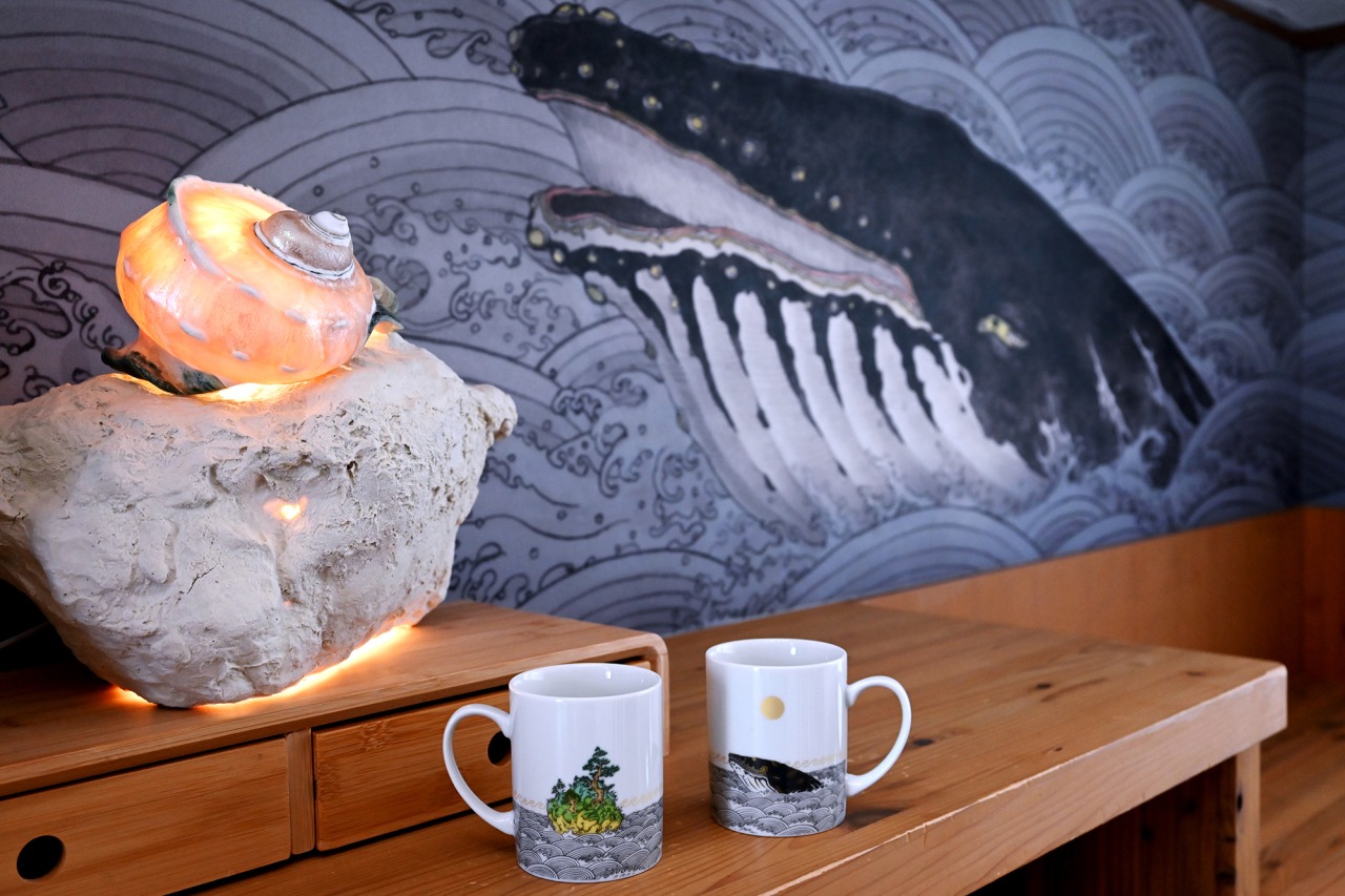 夜光貝のランプの下のゴツゴツした岩は九谷焼の磁土で作られ、部屋でコーヒーやお茶を飲むマグカップにも鯨と島が描かれています。このマグカップはフロントで購入も可能で、細部までプロデュースされていることに感動してしまいます。