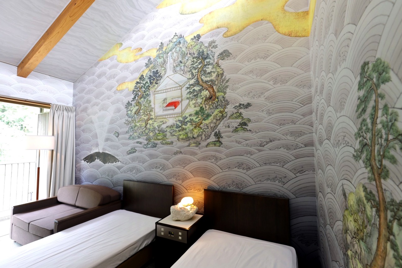 能美市は九谷焼の産地の一つで、ホテルの客室は市内在住やゆかりのある九谷焼の若手作家が1人1部屋ずつ担当し、それぞれのアイデアと作品でプロデュースしています。2022年に5室が完成していましたが、ラウンジの壁画と残りの部屋も完成し、2023年3月中旬から全室で宿泊が可能に! 今回の取材では6部屋を見せていただきましたが、その中から3部屋をご紹介します。