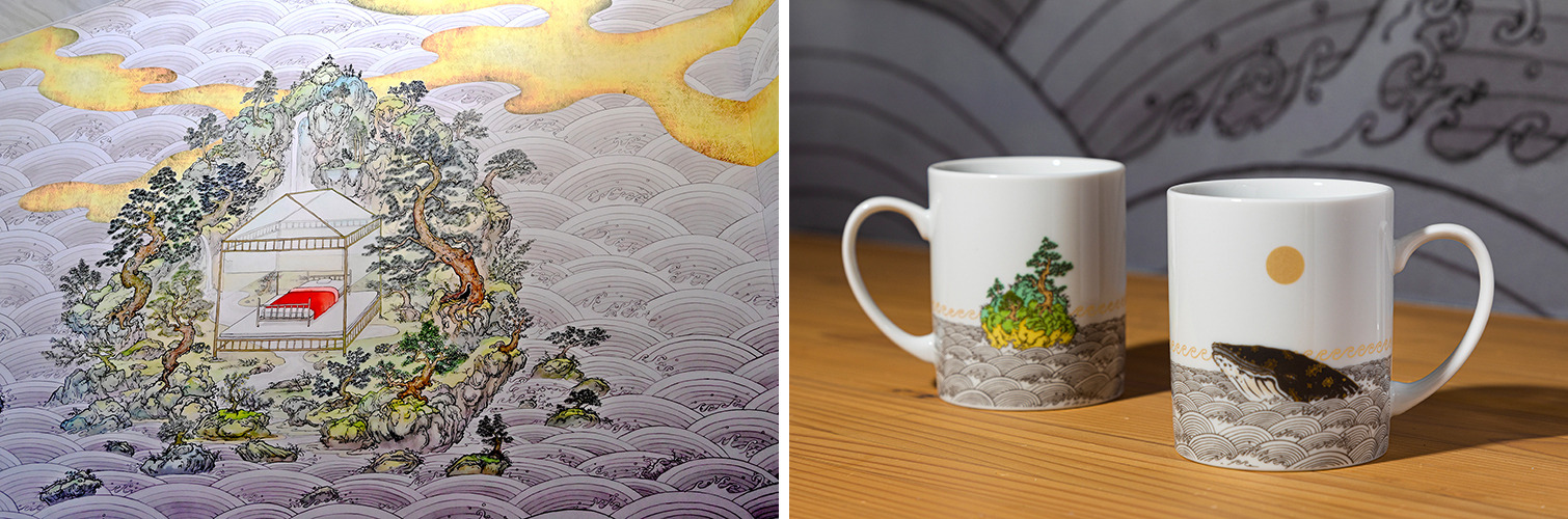 「SARAI」は、能美市の原風景ともいえる古墳群が広がる里山エリアにあり、夏になると窓の外に蛍が舞う姿も見られるそう。そんな情景からインスピレーションを得て、さまざまな小紋を赤絵細描で彩る「やま小紋」として随所に展開。山の稜線には後光のような金の縁取りが施され、精密な赤絵細描のレリーフは山々の間から昇った太陽のようで、抽象パターンにも里山の風景にも見ることができます。