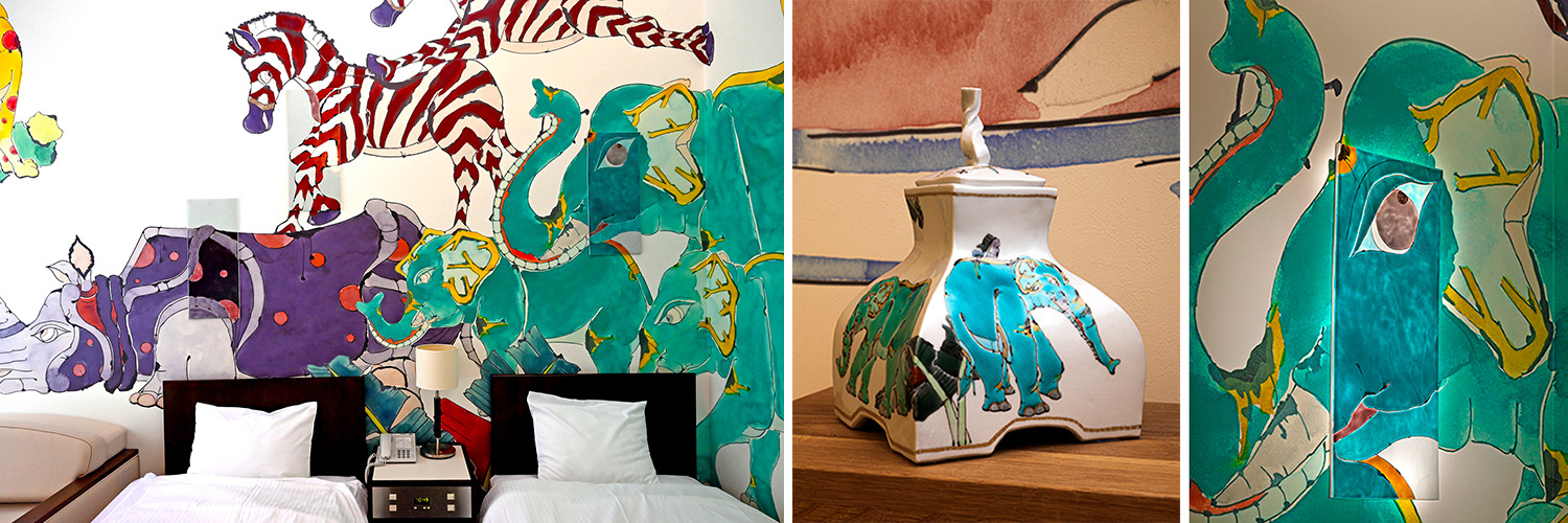 動物たちは九谷五彩の紺青・赤・紫・緑・黄をベースに、家族愛の象徴である象、ブッダの「犀の角のようにただ独り歩め」という言葉に象徴される、黙々と目的に向かって邁進する犀(サイ)などが、独自の表現とデザインで描かれています。絵の一部には九谷焼の陶板が重ねられ、壁紙とつややかな焼き物との質感の違いも見どころです。