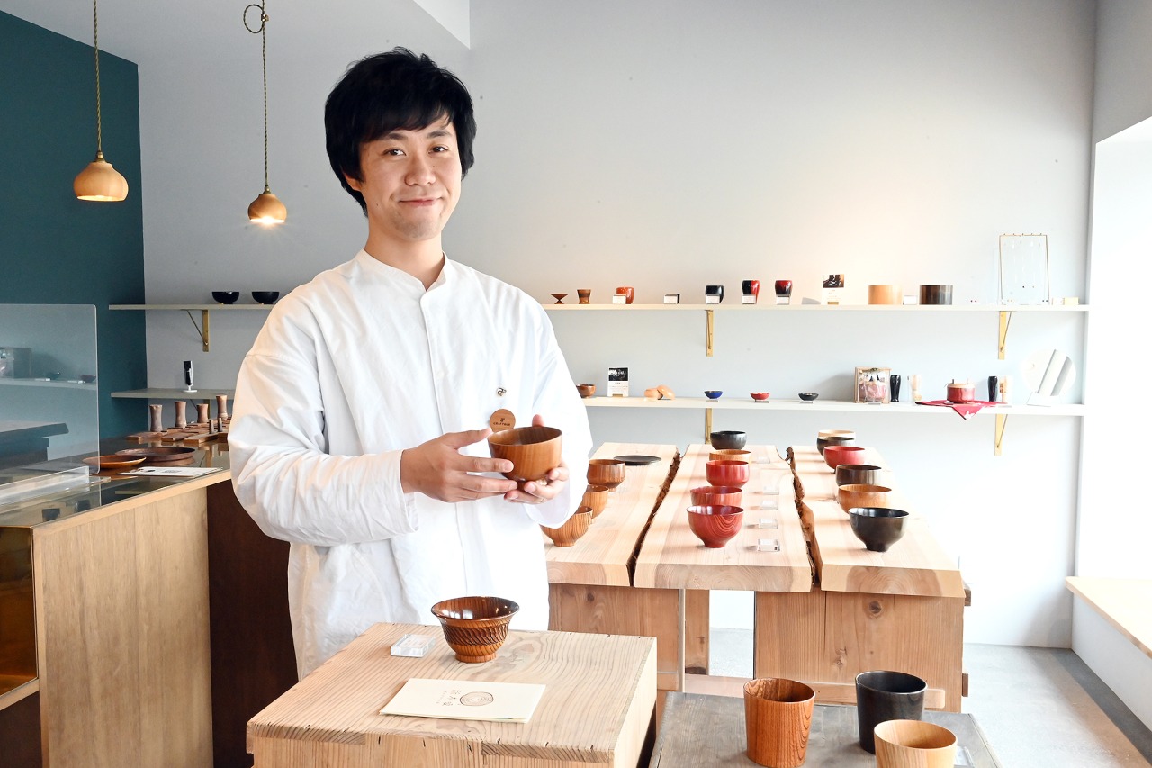 ツアーの出発点となる店舗は山中温泉バスターミナルのすぐそば、まさに温泉街の入口にあります。店内では提携する工房で製作された作品など、現代の暮らしに合う漆の器や蒔絵が施されたアクセサリーなどが展示・販売されているので、ツアー以外でも山中漆器のセレクトショップとして利用するのもおすすめ。