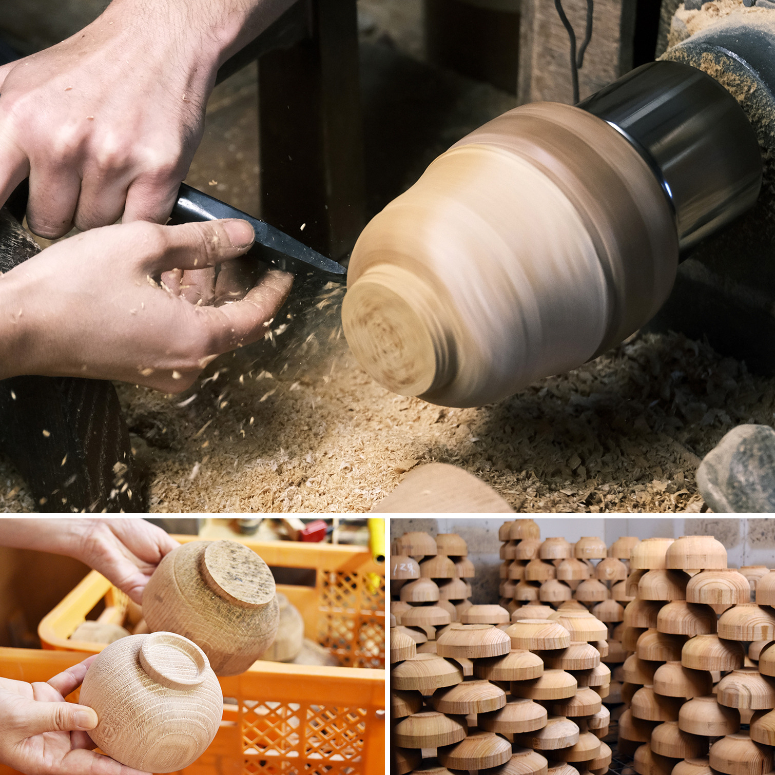 木地挽きの工房を見学すると、製材して輪切りになった木材から、木目の出方や製品サイズに合わせてカットし、お椀の形になっていく様子がよくわかります。