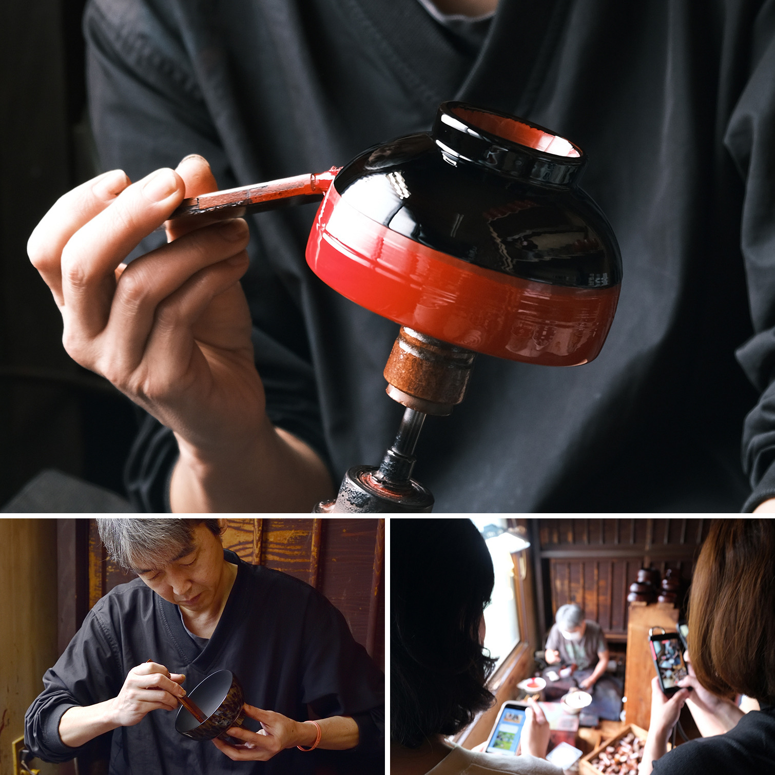 漆器は基本的に分業で作られ、山中では木地づくりから、美しい手仕事の真骨頂ともいわれる蒔絵技師まで、多様な職人・作家が活躍しています。しかし、職人の伝統技術の多くは公開されず、関係者以外は立ち入り禁止の工房も珍しくありません。
