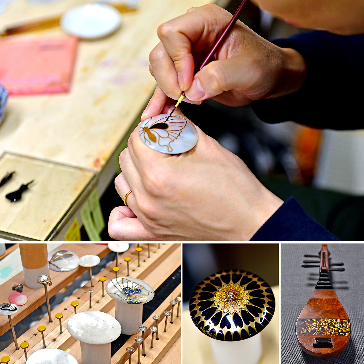 蒔絵師の工房では、漆で絵や文様を描いて金・銀などの金属粉を蒔いて付着させる蒔絵や、夜光貝・アワビ貝・蝶貝などの貝殻を切って文様にする螺鈿など、漆工芸の加飾技法が見学できます。