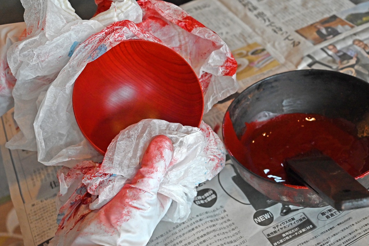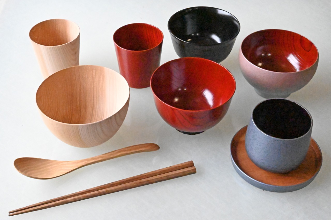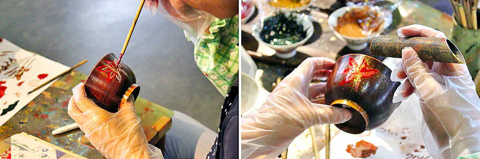 絵付けに比べて拭き漆は短時間で作業ができるので、絵付け用の色漆を使ってサインや絵柄を入れることもできます。同時に複数の作品を作ることもでき、体験料1,650円+木地(お椀・カップ2,750円、箸・カトラリー1,100円)代金なので、お椀と箸をセットで作るのもいいですね(送料別途)。
