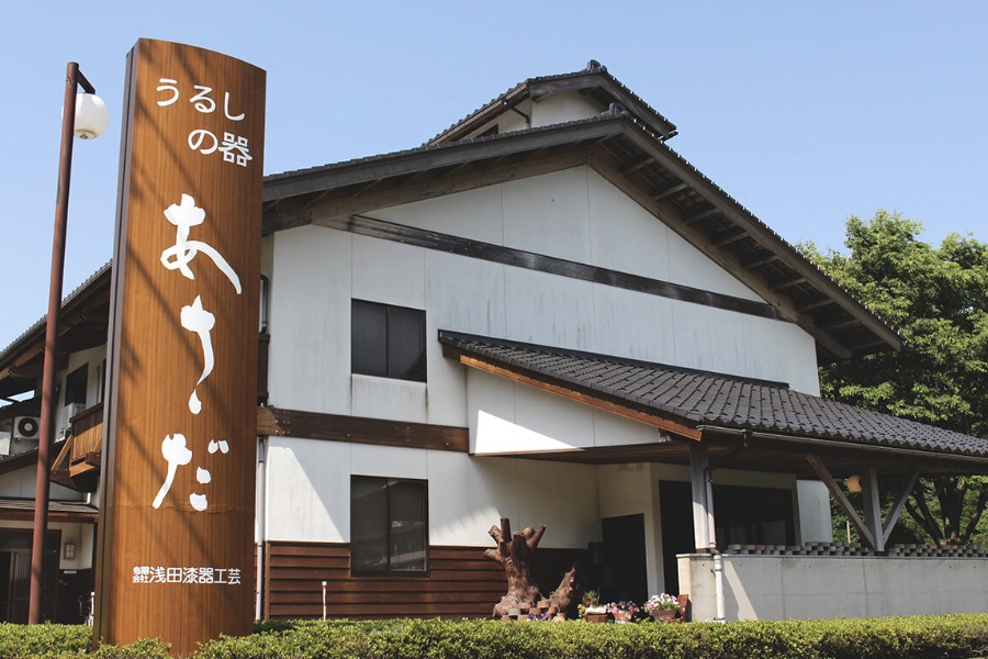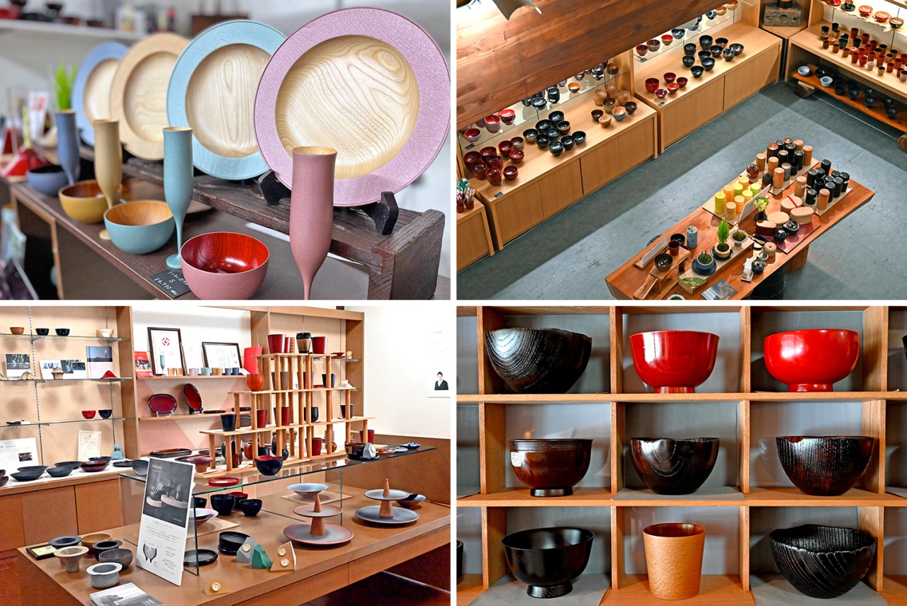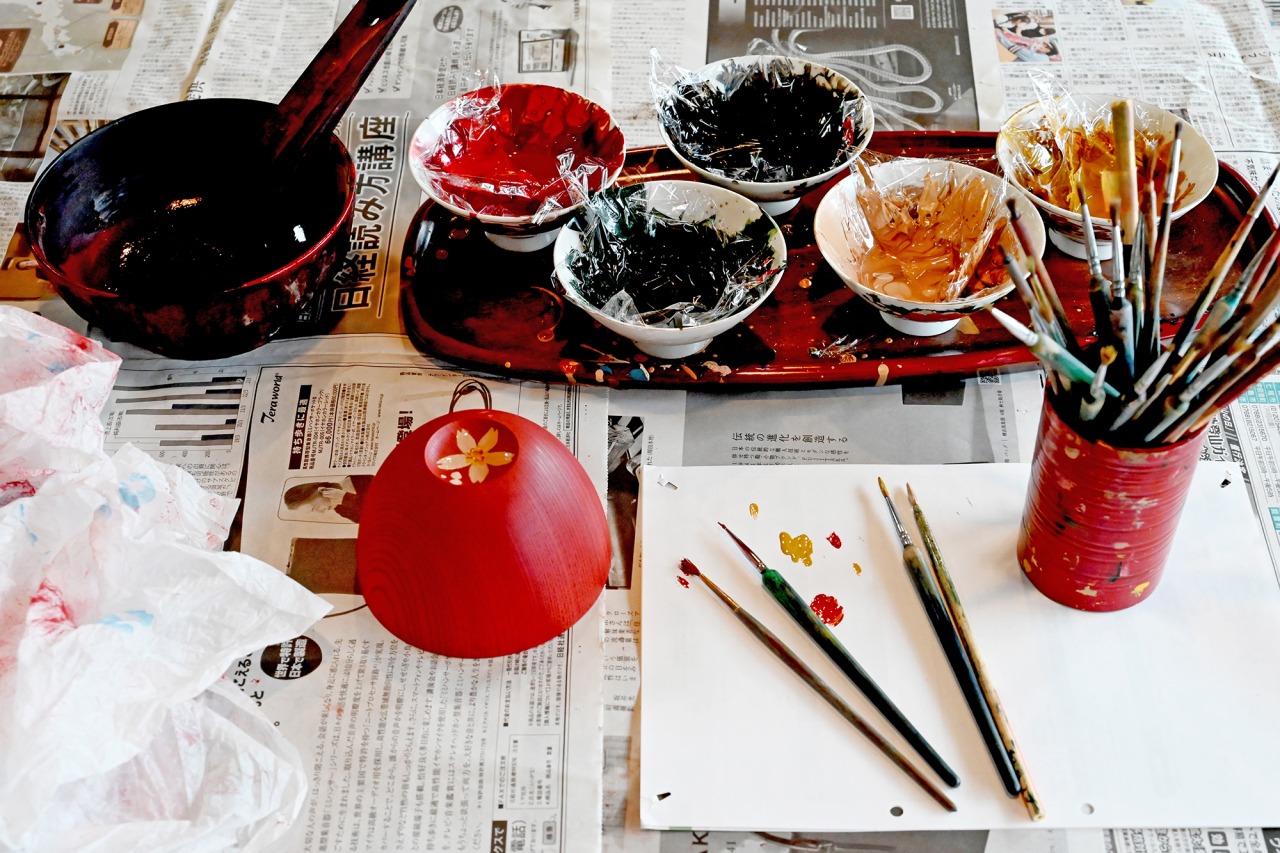 店内では国産の木にこだわった漆器類が展示・販売され、木のぬくもりが伝わってくる木目を活かした拭き漆の器や、伝統を受け継ぎながらも独自に開発した淡いピンクやブルーの漆器など、カジュアルな品が多いのが特徴。このお店の2階がワークショップのスペースで、プロの職人さんの手ほどきを受けながら、漆絵付けと拭き漆の漆器づくりが体験できます。
