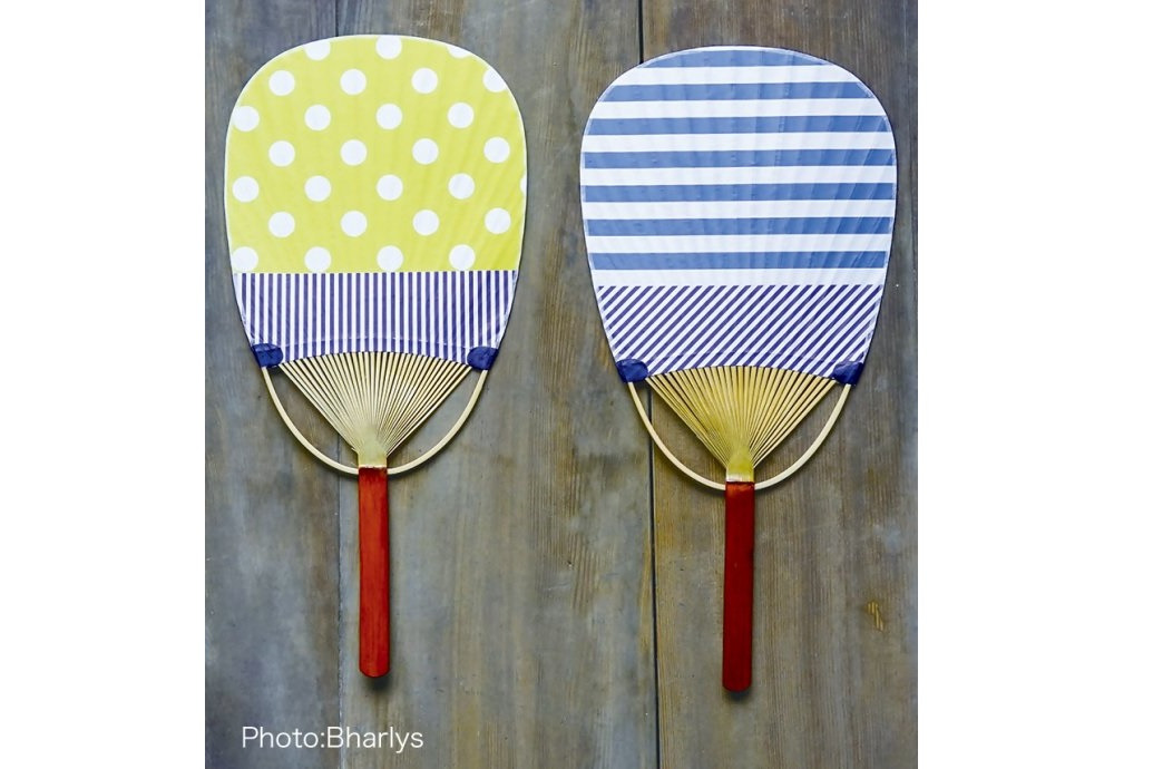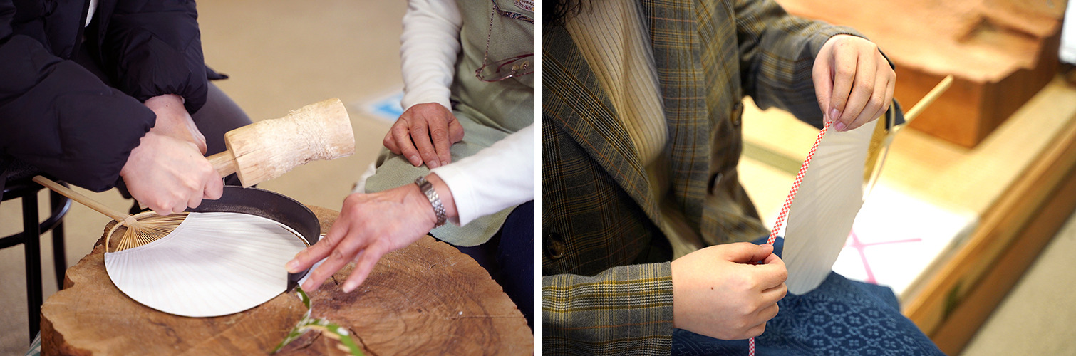 木槌で叩いて型取りして、余分な部分を切り取ってうちわの形に仕上げます。最後にうちわのヘリに細長い紙を貼ったら作業は終了!
