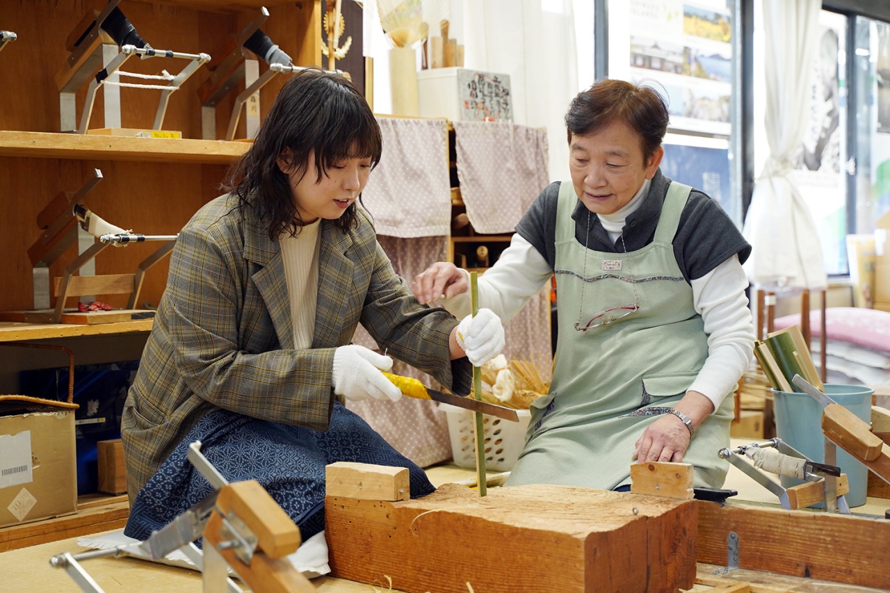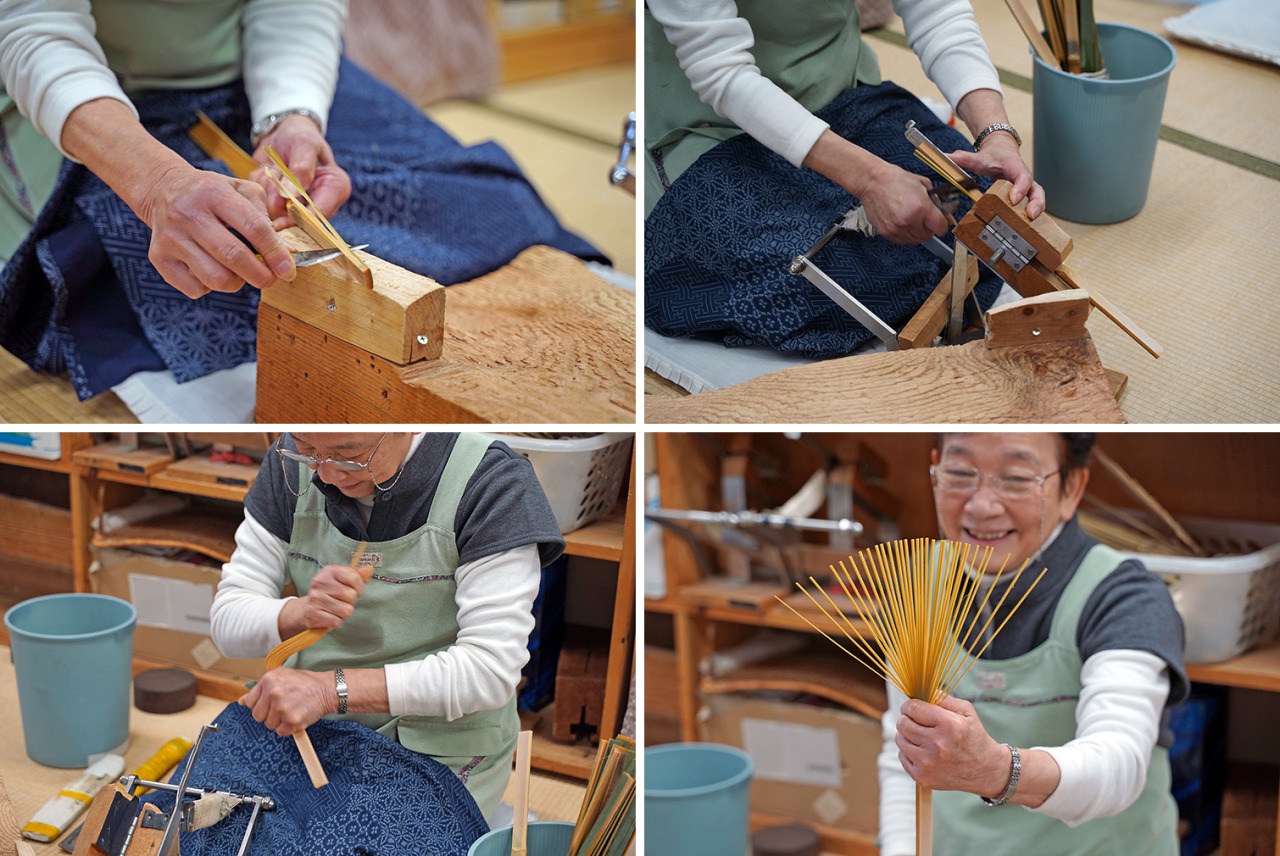 「うちわ工房 竹」には、三谷さんをはじめ6名の丸亀うちわ職人が在籍し、制作体験では骨制作、貼り、たたきなどを丁寧に教えてくれます。竹によって仕上がりに違いが生まれるので、うちわづくりに適した竹を選ぶことが大切です。丸亀うちわは「男竹=真竹」を使用し、良い竹を見極めるには「節」を見るのがポイントなのだとか。